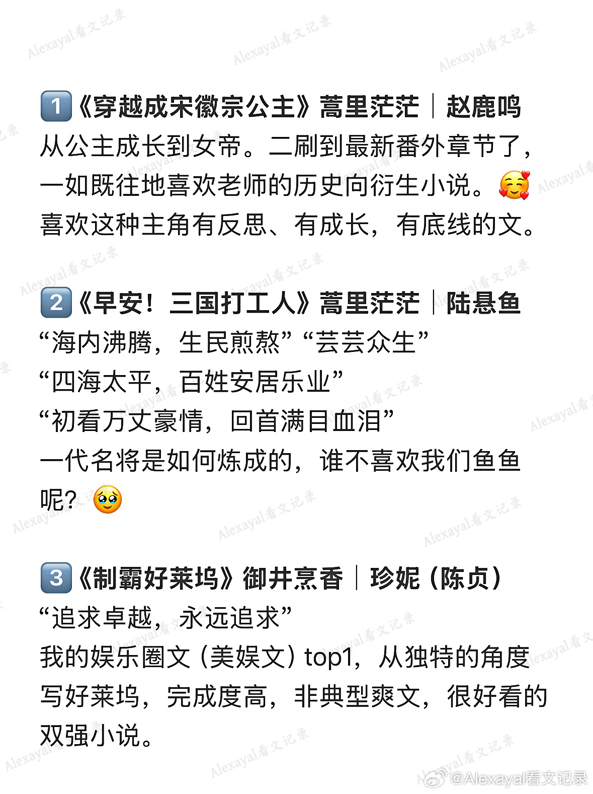 1️⃣ 《穿越成宋徽宗公主》蒿里茫茫|赵鹿鸣从公主成长到女帝。二刷到最新番外章节了,一如既往地喜欢老师的历史向衍生小说。🥰 喜欢这种主角有反思、有成长,有底线的文。2️⃣ 《早安!三国打工人》蒿里茫茫|陆悬鱼“海内沸腾,生民煎熬”“芸芸众生”“四海太平,百姓安居乐业”“初看万丈豪情,回首满目血泪”一代名将是如何炼成的,谁不喜欢我们鱼鱼呢?🥹3️⃣ 《制霸好莱坞》御井烹香|珍妮(陈贞)“追求卓越,永远追求”我的娱乐圈文(美娱文)top1,从独特的角度写好莱坞,完成度高,非典型爽文,很好看的双强小说。