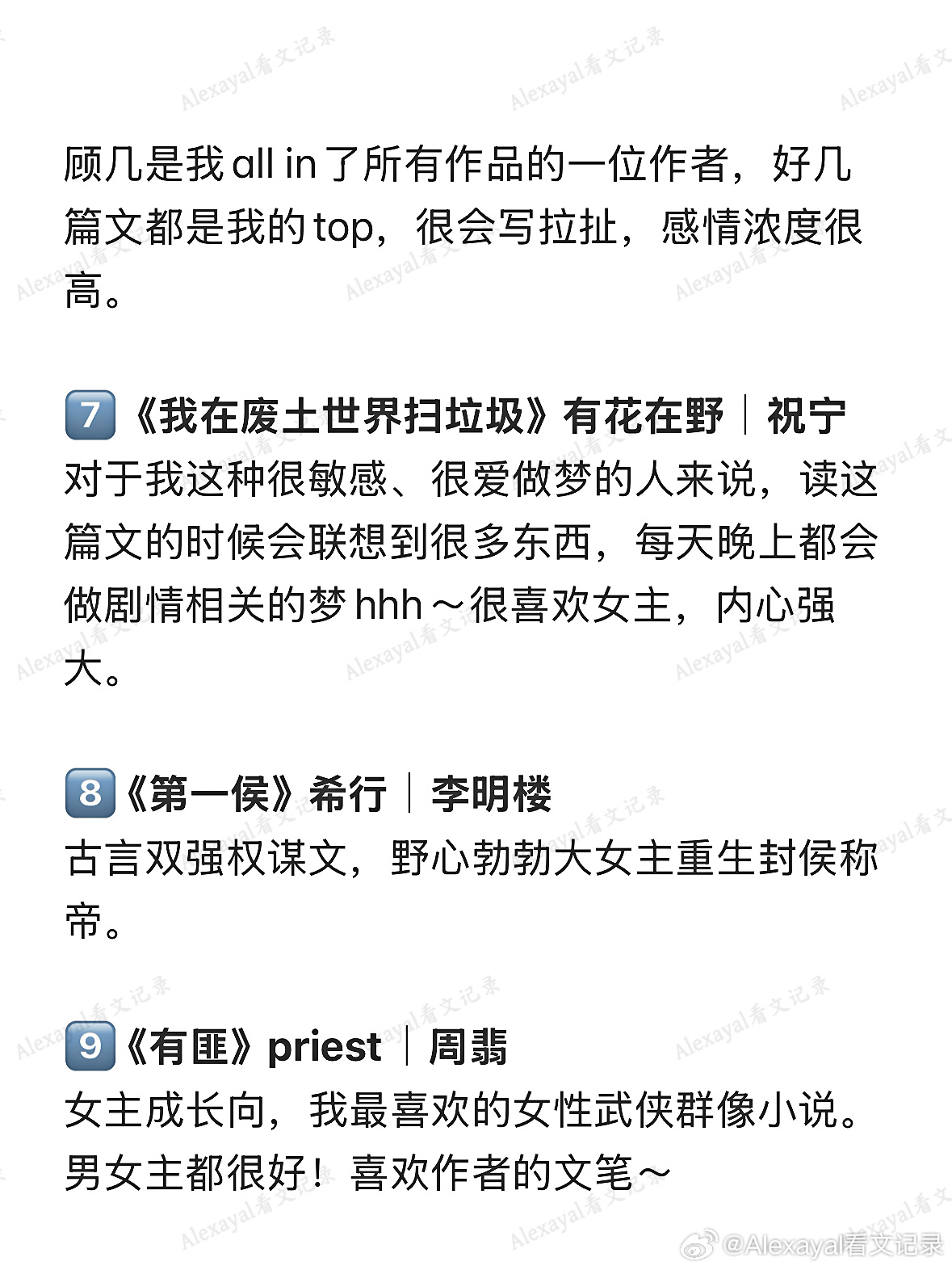 7️⃣ 《我在废土世界扫垃圾》有花在野|祝宁对于我这种很敏感、很爱做梦的人来说,读这篇文的时候会联想到很多东西,每天晚上都会做剧情相关的梦hhh~很喜欢女主,内心强大。