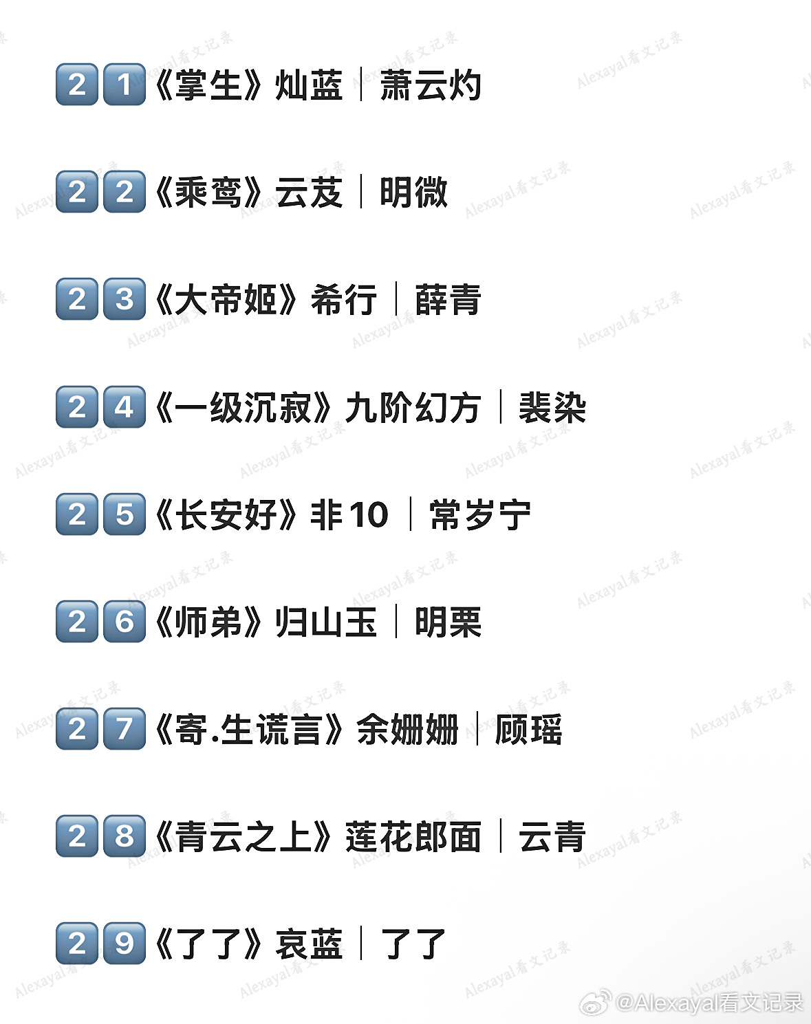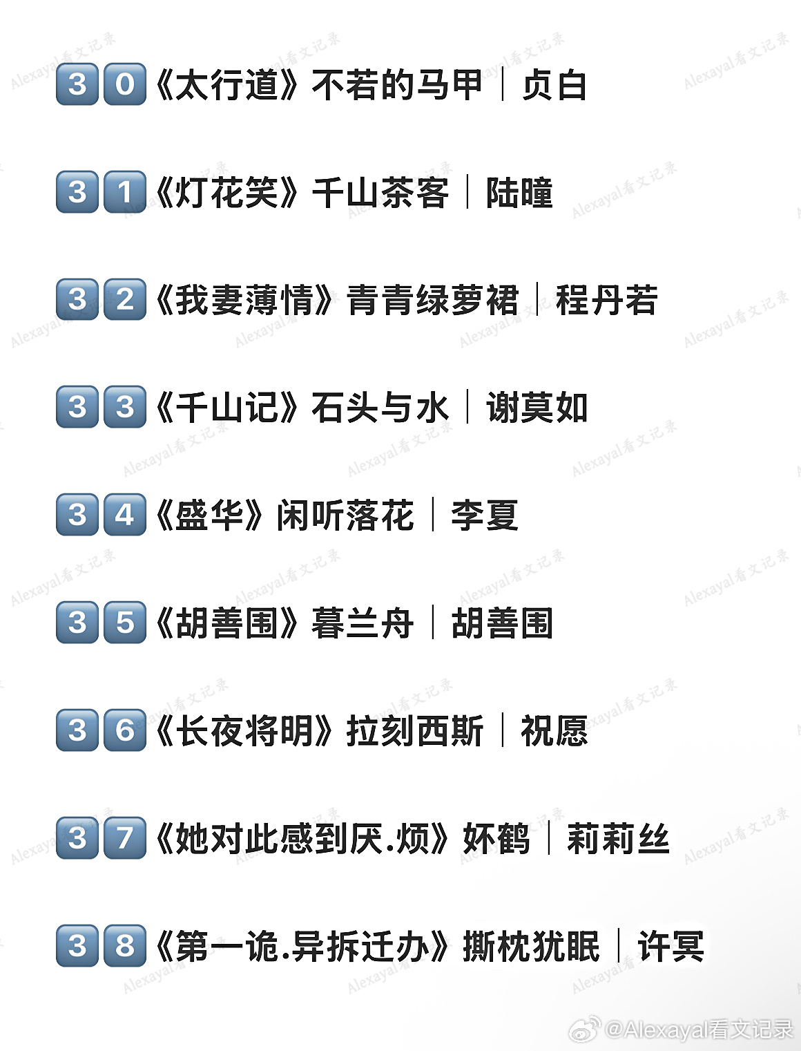 2️⃣5️⃣ 《长安好》非10|常岁宁2️⃣6️⃣ 《师弟》归山玉|明栗2️⃣7️⃣ 《寄.生谎言》余姗姗|顾瑶2️⃣8️⃣ 《青云之上》莲花郎面|云青2️⃣9️⃣ 《了了》哀蓝|了了3️⃣0️⃣ 《太行道》不若的马甲|贞白3️⃣1️⃣ 《灯花笑》千山茶客|陆曈3️⃣2️⃣ 《我妻薄情》青青绿萝裙|程丹若3️⃣3️⃣ 《千山记》石头与水|谢莫如3️⃣4️⃣ 《盛华》闲听落花|李夏3️⃣5️⃣ 《胡善围》暮兰舟|胡善围3️⃣6️⃣ 《长夜将明》拉刻西斯|祝愿3️⃣7️⃣ 《她对此感到厌.烦》妚鹤|莉莉丝