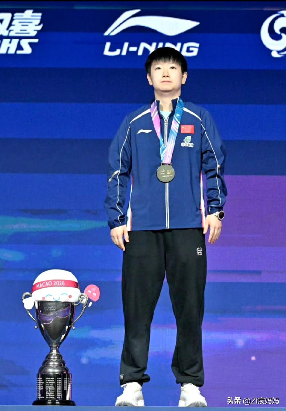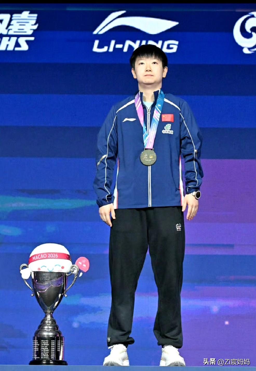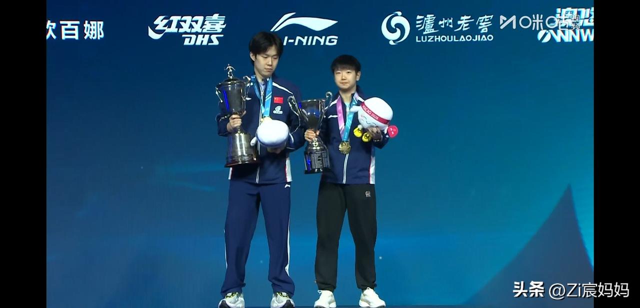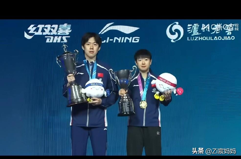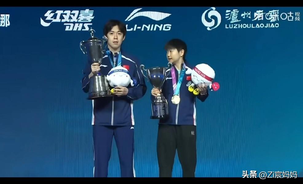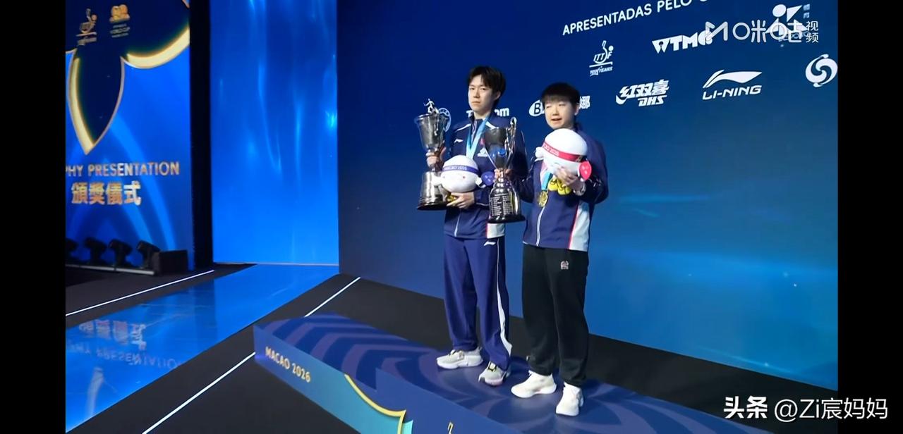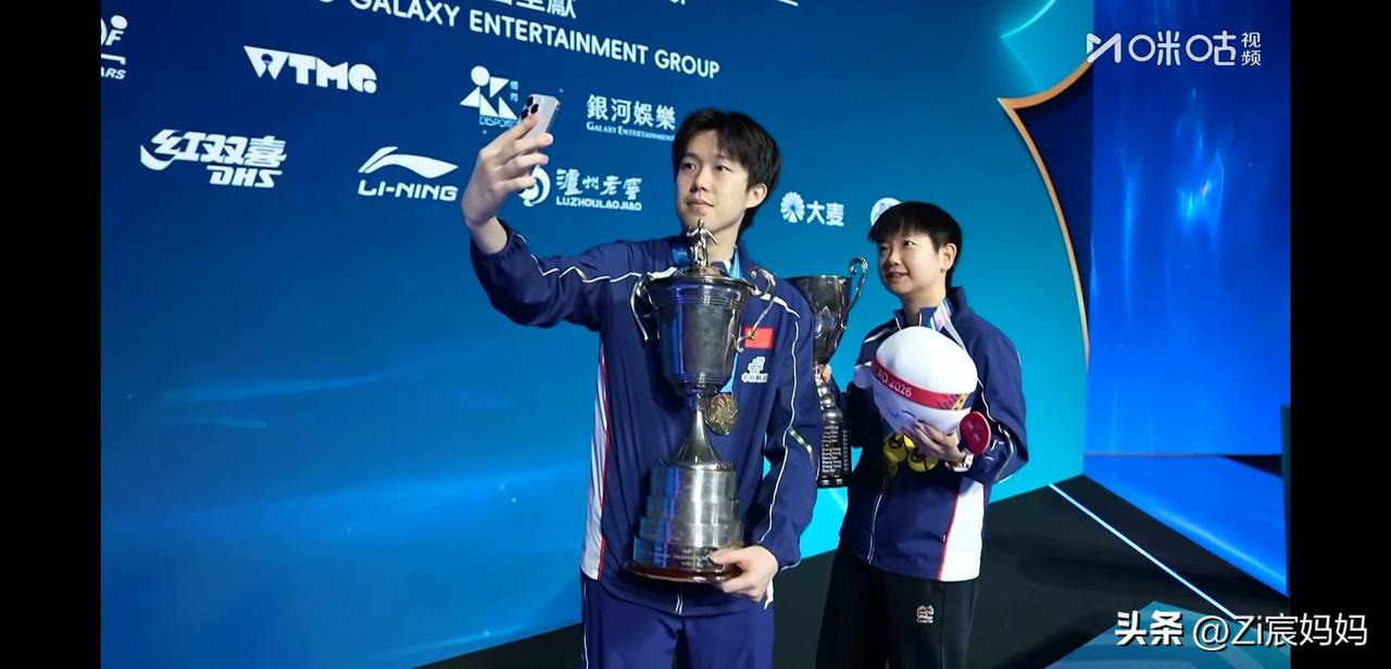 昨晚澳门世界杯男女冠军合影的时候, 莎莎一上来, 楚钦就问:你的帽呢? 莎莎:这个没有帽。 要自拍的时候大头说:你拍,你拍, 哈哈,莎莎自轰然不动,你拍! 楚钦乖乖接过手机拍照。 莎莎的奖杯确实没有帽儿, 波仔要坐在奖杯上呢。 网友说别人站领奖台上不是恭喜就是寒暄,૮₍◜ෆ◝.₎ა 你俩不是吵架就是讨论有没有帽儿。 顶峰相见,王楚钦孙颖莎!