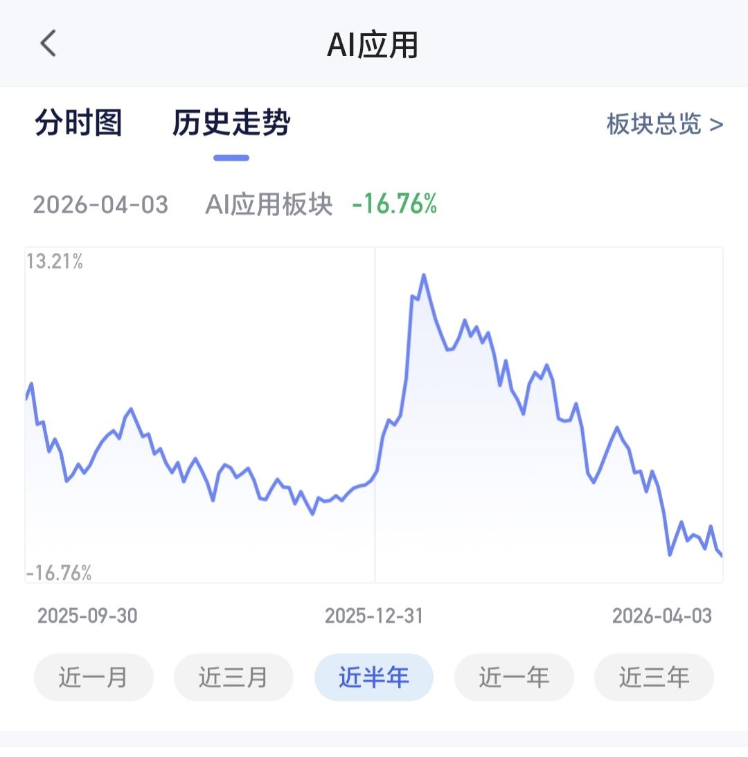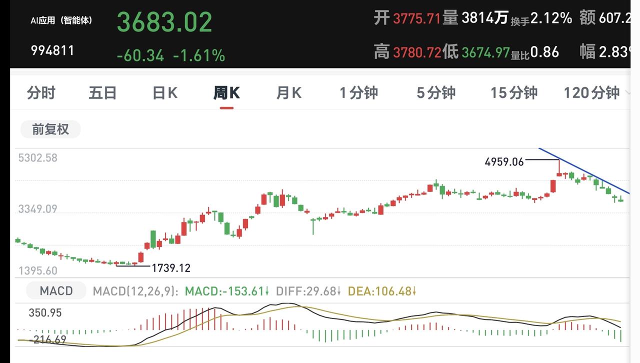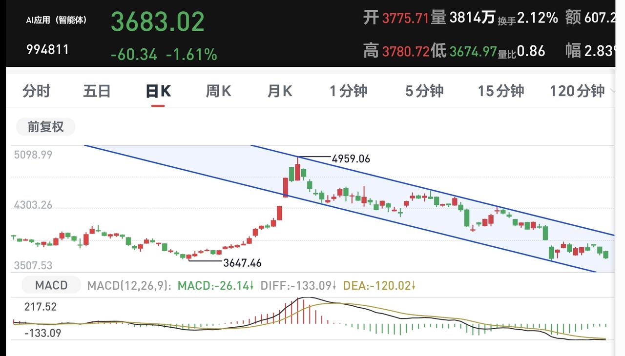 基金:远离热门板块,才是正确的选择 AI应用板块是一个热门板块,上周五下跌了0.94%,是连续第2个交易日下跌,持有人数在所有板块当中排名第10位,散户人数也是不少。 AI应用板块近三个月以来下跌了9.83%,近六个月以来下跌了16.76%,近一年以来下跌了2.07%,近三年以来下跌了25.52%,这个板块有26只基金,各只基金的情况见下面的截图6。 AI应用板块日线级别处于下跌通道中,距离下跌通道上下轨的空间差不多远,只要保持在这个下跌通道中震荡,短线持有的人就需要注意风险,只有在上涨突破下跌通道下轨线的时候,才可以考虑要不要进场。 AI应用板块周线级别短期收到了一条下跌趋势线的压制,这个周线级别下跌趋势线的时间段,日线级别下跌通道的时间段相重合,所以,近期只要观察日线级别的下跌通道就可以了。 AI应用板块我现在持有一只基金,持有金额451元,持有亏损88元,只有亏损率16.73%,累计亏损金额也是88元,每天定投10块钱。 这只基金我是在最高处进场,进场的时候没有配置底仓,只是设置的每天定投10块钱,我会继续定投下去,等待到手动进场机会的时候,我会有手动操作。 玩基金最重要的就是仓位控制,很多时候,持有多少比持有什么更重要,在相对高位区域轻仓,在相对低位区域重仓,比在相对高位区域和相对区低位区域持有什么更重要。 在阶段性上涨的阶段,也是利润增长最快的阶段,这个时候保持着较重的仓位是很重要的,只要你能够保持均衡配置,跑赢市场指数的上涨应该是大概率的。 指数从去年3040点上涨到今年的4197点,我在这个过程当中的仓位也发生了变化,在3040点的时候我是满仓,在4197点的那一天再一次降低了仓位,把仓位降低到了四成以下,现在就是在等待市场止跌企稳,然后把仓位重新打到满仓,迎接新一轮阶段性上涨的到来。 这样的仓位调整,比我持有什么样的板块更重要,在阶段性下跌的时候,没有哪一个板块能够躲开下跌,在阶段性上涨的时候,没有哪一个板块会拒绝上涨,只是他们存在着上涨和下跌幅度不一样区别。 但许多人却确是相反,他们更加追求的是热门板块,认为只有手握热门板块才能盘满钵满,殊不知把自己推上了危险的境地,套人的板块都是热门板块,或者是曾经热门过的板块,越热的板块套人的概率越大,越热的板块套人的深度越大,远离热门板块,才是正确的选择。 我写文章请大家过来欣赏,许多人看了以后,什么痕迹都没有留下,走的时候也是一声不吭,连一个点赞,连一句评论都不会留下,走的是那样的无声无息,这样的人是不地道的,没有做人最起码的准则,我不愿意与这样的人交朋友。