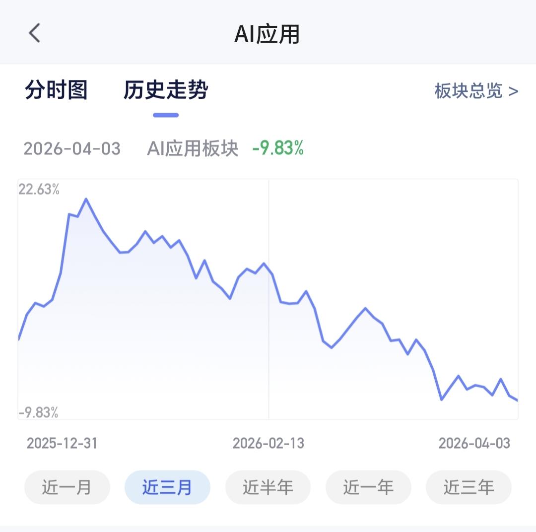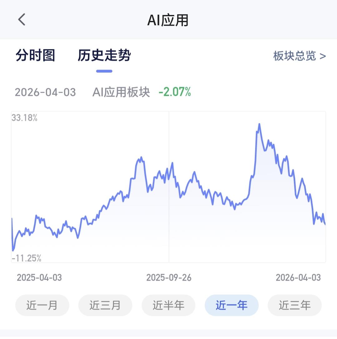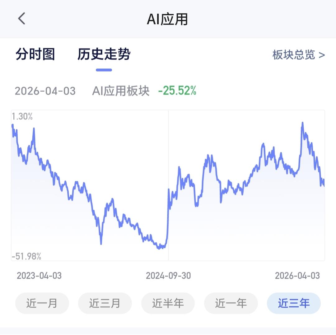 基金:远离热门板块,才是正确的选择 AI应用板块是一个热门板块,上周五下跌了0.94%,是连续第2个交易日下跌,持有人数在所有板块当中排名第10位,散户人数也是不少。 AI应用板块近三个月以来下跌了9.83%,近六个月以来下跌了16.76%,近一年以来下跌了2.07%,近三年以来下跌了25.52%,这个板块有26只基金,各只基金的情况见下面的截图6。 AI应用板块日线级别处于下跌通道中,距离下跌通道上下轨的空间差不多远,只要保持在这个下跌通道中震荡,短线持有的人就需要注意风险,只有在上涨突破下跌通道下轨线的时候,才可以考虑要不要进场。 AI应用板块周线级别短期收到了一条下跌趋势线的压制,这个周线级别下跌趋势线的时间段,日线级别下跌通道的时间段相重合,所以,近期只要观察日线级别的下跌通道就可以了。 AI应用板块我现在持有一只基金,持有金额451元,持有亏损88元,只有亏损率16.73%,累计亏损金额也是88元,每天定投10块钱。 这只基金我是在最高处进场,进场的时候没有配置底仓,只是设置的每天定投10块钱,我会继续定投下去,等待到手动进场机会的时候,我会有手动操作。 玩基金最重要的就是仓位控制,很多时候,持有多少比持有什么更重要,在相对高位区域轻仓,在相对低位区域重仓,比在相对高位区域和相对区低位区域持有什么更重要。 在阶段性上涨的阶段,也是利润增长最快的阶段,这个时候保持着较重的仓位是很重要的,只要你能够保持均衡配置,跑赢市场指数的上涨应该是大概率的。 指数从去年3040点上涨到今年的4197点,我在这个过程当中的仓位也发生了变化,在3040点的时候我是满仓,在4197点的那一天再一次降低了仓位,把仓位降低到了四成以下,现在就是在等待市场止跌企稳,然后把仓位重新打到满仓,迎接新一轮阶段性上涨的到来。 这样的仓位调整,比我持有什么样的板块更重要,在阶段性下跌的时候,没有哪一个板块能够躲开下跌,在阶段性上涨的时候,没有哪一个板块会拒绝上涨,只是他们存在着上涨和下跌幅度不一样区别。 但许多人却确是相反,他们更加追求的是热门板块,认为只有手握热门板块才能盘满钵满,殊不知把自己推上了危险的境地,套人的板块都是热门板块,或者是曾经热门过的板块,越热的板块套人的概率越大,越热的板块套人的深度越大,远离热门板块,才是正确的选择。 我写文章请大家过来欣赏,许多人看了以后,什么痕迹都没有留下,走的时候也是一声不吭,连一个点赞,连一句评论都不会留下,走的是那样的无声无息,这样的人是不地道的,没有做人最起码的准则,我不愿意与这样的人交朋友。