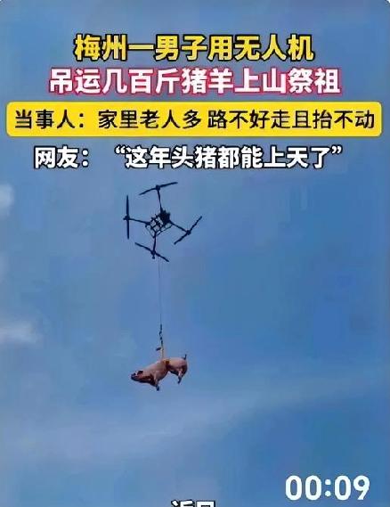 清明节出现与时俱进新风俗: 无人机天降猪羊至山里祖坟, 梅州一男子硬核祭祖引热议! 当传统祭祖遇上现代科技,会擦出怎样的火花?近日,广东梅州上演了一幕令人瞠目结舌的“硬核”祭祖大戏:几百斤的猪羊不再靠人肩挑背扛,而是被一架无人机稳稳吊运至深山祖坟前。这一创举不仅解决了山路难行的痛点,更让网友们惊叹:“这年头,连猪都能‘飞天’了!” 🚁 困境破局:两公里山路的“不可能任务”。清明时节,细雨纷纷,正是慎终追远之际。对于家住广东梅州的周先生而言,今年的祭祖之路却格外艰难。 据周先生介绍,前往祖坟的山路蜿蜒崎岖,单程长达两公里。按照当地习俗,祭品必须丰盛,整猪、整羊、香烛以及各式纸扎用品缺一不可。这些物资加起来重达数百斤,对于年轻力壮者尚且是重担,更何况家中长辈众多,体力有限。 “路不好走,老人根本抬不动。”面对现实困境,周先生没有选择简化仪式,也没有让老人勉强负重,而是灵机一动,将目光投向了手中的高科技装备——工业级无人机。 💡 智慧传承:科技赋能下的孝心表达。说干就干。在周先生的操作下,无人机化身“空中搬运工”,呼啸着腾空而起。巨大的旋翼搅动山风,下方悬挂的猪羊随着机身平稳上升,沿着陡峭的山径直抵目的地。 这一幕,既保留了传统祭祖的庄重与完整,又巧妙规避了体力消耗的难题。周先生的做法并非对传统的亵渎,恰恰相反,这是一种充满温情的变通:用现代技术守护老人的安康,让孝心不再被山路阻隔。 🔥 网友热评:高手在民间,办法总比困难多。视频一经流出,迅速在网络引发轰动,评论区瞬间变成了“脑洞大开”的现场: △惊叹派:“活久见!这年头猪都能上天了,真是开了眼界!” 点赞派:“高手在民间!这才是真正的‘科技改变生活’,办法总比困难多。” △幽默派:“祖先收到这份‘空投’大礼,估计也要感叹时代变了。” △理性派:“只要安全合规,这种创新值得提倡。孝敬老人,形式可以多样,心意才是核心。” ✍️ 深度观察:传统与现代的温柔和解。周先生的“无人机祭祖”,看似荒诞有趣,实则折射出当代社会在传统习俗传承中的智慧。 在老龄化社会背景下,许多传统习俗因体力要求高而面临执行难的尴尬。周先生的尝试告诉我们:传统不需要僵化守旧,科技也不必冷冰冰。当两者结合,既能延续文化的血脉,又能体现对人性的关怀。 或许,未来的清明节,我们会看到更多这样的“新民俗”:机器人清扫墓碑、VR 远程祭拜……但只要那份慎终追远的初心不变,形式上的创新,便是对传统最好的致敬。 从“肩挑背扛”到“云端运输”,变的只是方式,不变的是那份沉甸甸的亲情与敬意。为这位梅州男子的智慧点赞,也为所有在传统与现代间寻找平衡点的普通人喝彩!