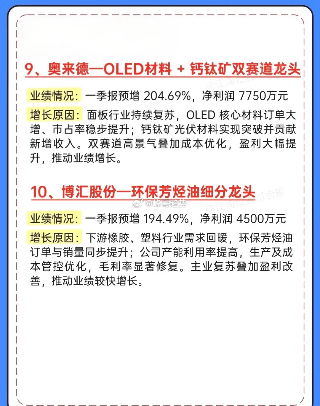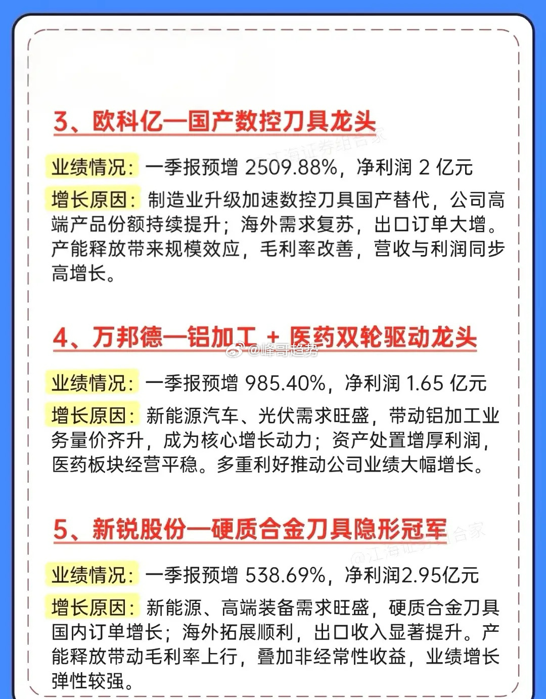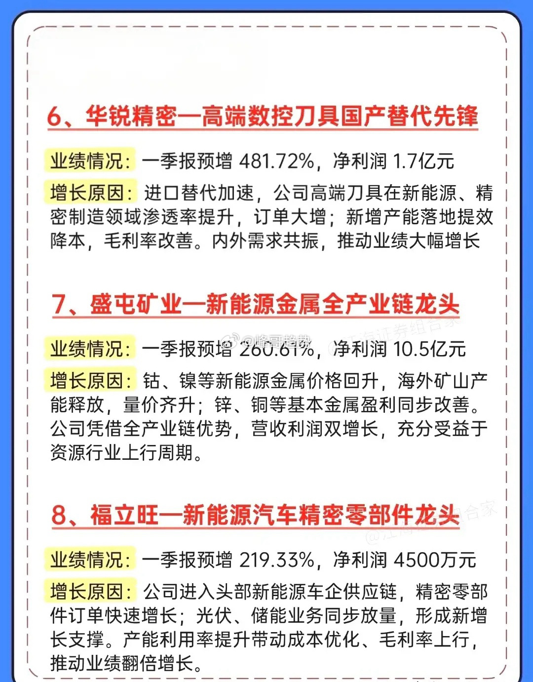 一季报大爆发!10家业绩暴增龙头全梳理,最高狂涨5021%!一季报行情正式打响!这份超预期增长名单直接封神,10家公司业绩集体炸裂,最高同比暴增超5000%,覆盖存储芯片、高端刀具、新能源、医药等多个高景气赛道,每一家都藏着业绩爆发的核心逻辑!德明利以5021.28%的增速一骑绝尘,存储芯片国产替代+AI算力需求双轮驱动,子公司股权出售更是给业绩添了一把火;富祥药业、欧科亿紧随其后,2700%+、2500%+的增速,分别在CDMO、数控刀具赛道实现国产替代与订单爆发。从万邦德的铝加工+医药双轮驱动,到新锐股份、华锐精密的刀具国产替代浪潮;从盛屯矿业的新能源金属周期上行,到福立旺的新能源车零部件放量;从奥来德的OLED+钙钛矿双赛道共振,到博汇股份的环保芳烃油复苏,每一家都踩中了行业景气度的风口。投资收益、主业复苏、国产替代、周期上行,多重利好共振下,这些一季报超预期的公司,正是当下市场最具确定性的方向。⚠️ 风险提示:以上内容仅为信息整理,不构成任何投资建议,股市有风险,入市需谨慎。财经