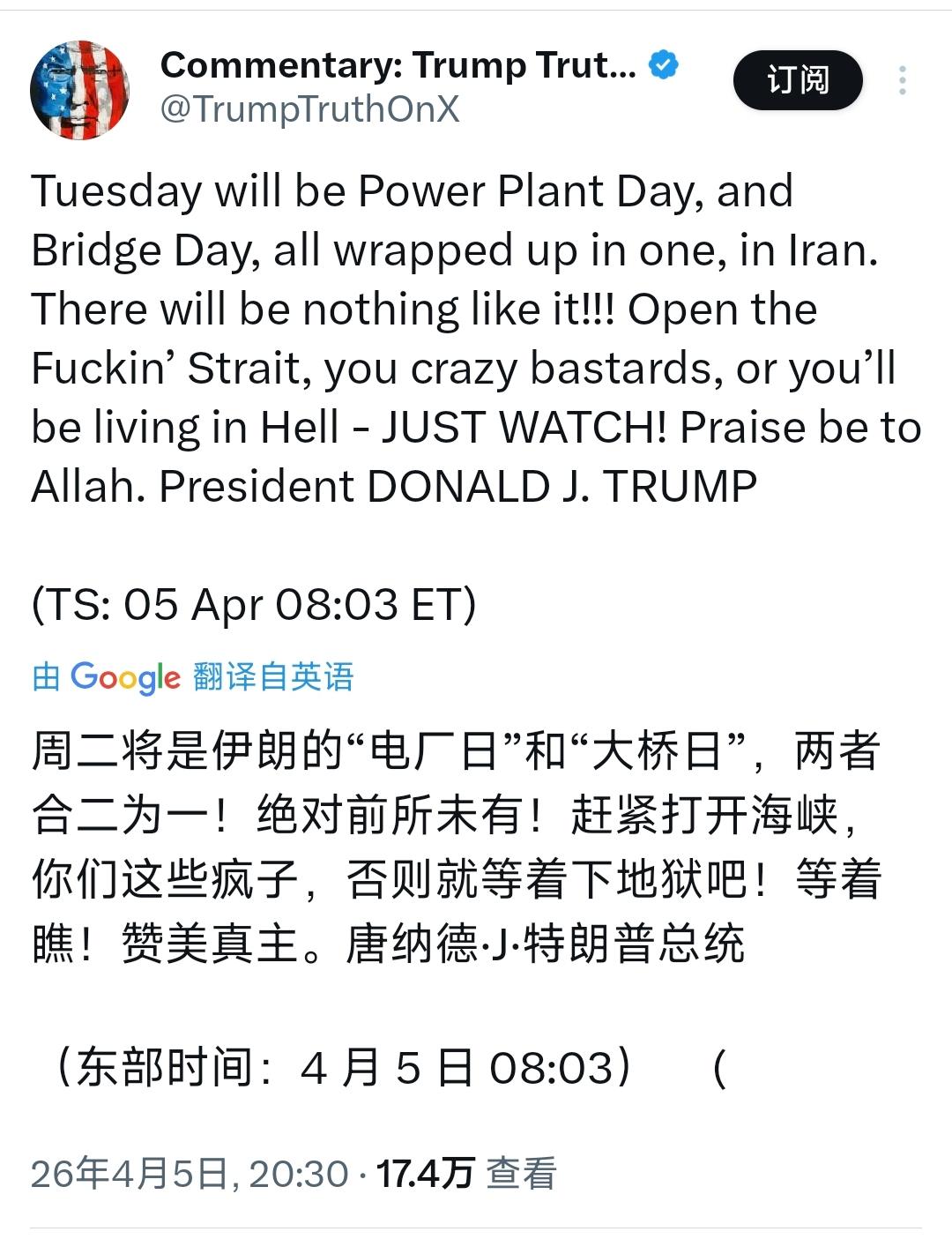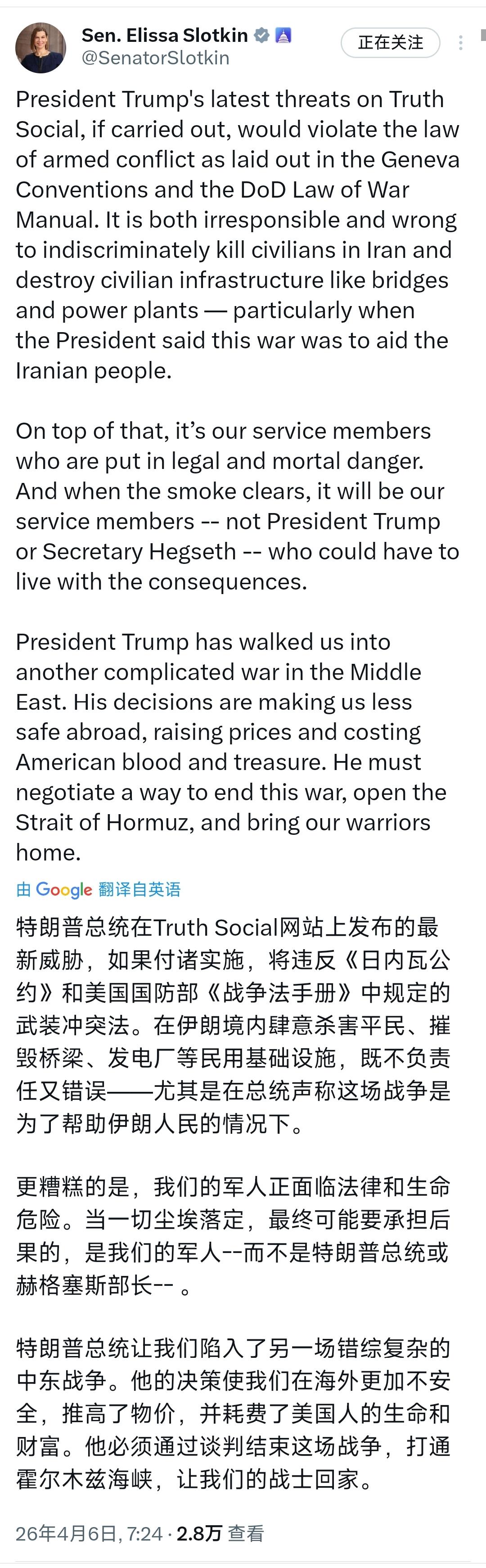 美国民主党籍参议员艾丽莎·斯洛特金(Elissa Slotkin)今天(北京时间4月6日)发文写道:“特朗普总统在真相社交网站上发布的最新威胁,如果付诸实施,将违反《日内瓦公约》和美国国防部《战争法手册》中规定的武装冲突法。在伊朗境内肆意杀害平民,摧毁桥梁,发电厂等民用基础设施,既不负责任又错误尤其是在总统声称这场战争是为了帮助伊朗人民的情况下。 更糟糕的是,我们的军人正面临法律和生命危险。当一切尘埃落定,最终可能要承担后果的,是我们的军人,而不是特朗普总统或赫格塞斯部长。 特朗普总统让我们陷入了另一场错综复杂的中东战争。他的决策使我们在海外更加不安全,推高了物价,并耗费了美国人的生命和财富。他必须通过谈判结束这场战争,打通霍尔木兹海峡,让我们的战士回家。”(特朗普的发文见图三) [机智]评几句:民主党与共和党围绕这场伊朗战争的裂痕早已公开化,且正以肉眼可见的速度持续扩大。民主党籍参议员斯洛特金直言抨击特朗普的战争决策,直指其行动不负责任、将美军置于险境,这并非单纯的政策分歧,而是两党在中东战事上的彻底对立。共和党即便表面附和特朗普的激进外交策略,内部也难掩对战争代价的担忧,两党为了政治利益互相攻讦,全然不顾战争带来的民生与安全危机,美式党争在这场不义之战中暴露无遗,裂痕只会随着战争推进愈发难以弥合。 特朗普单方面发起的对伊朗侵略战争,从根源上就是彻头彻尾的非法行为。其行动不仅违背《日内瓦公约》与美国自身战争法,肆意轰炸伊朗民用设施、残害平民,更是无视美国宪法规定,绕开国会擅自发动战争,完全不具备任何合法授权。这场战争既无正当的防卫理由,也无法律层面的支撑,不过是特朗普为谋求政治私利的鲁莽冒险,最终却要让美军士兵承担法律与生命风险,耗费美国民众的财富与生命,所谓“帮助伊朗人民”的说辞,不过是掩盖非法战争的虚伪借口。