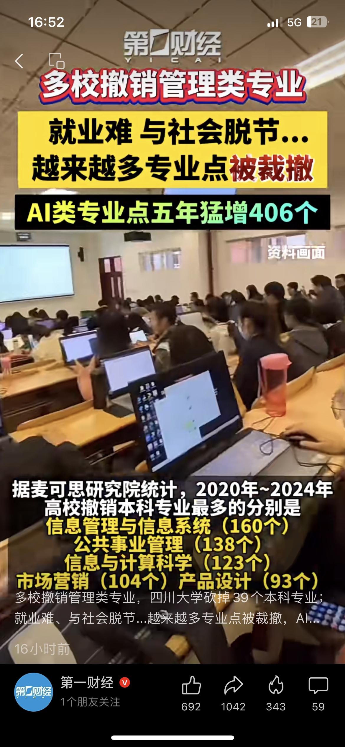 高校专业大洗牌!管理类成重灾区,报志愿别踩坑 高校专业大洗牌信号明确!管理类专业成撤销重灾区,AI类专业5年猛增406个。信息管理、公共事业管理等专业被大量撤销,核心就是就业难、内容空泛、与社会严重脱节。另一边人工智能等硬科技专业密集新增,成为主流方向。说白了,时代早已改变,没有硬技能就没有竞争力,家里有考生的一定要避开虚泛专业。 高校专业调整 AI专业 高考志愿
