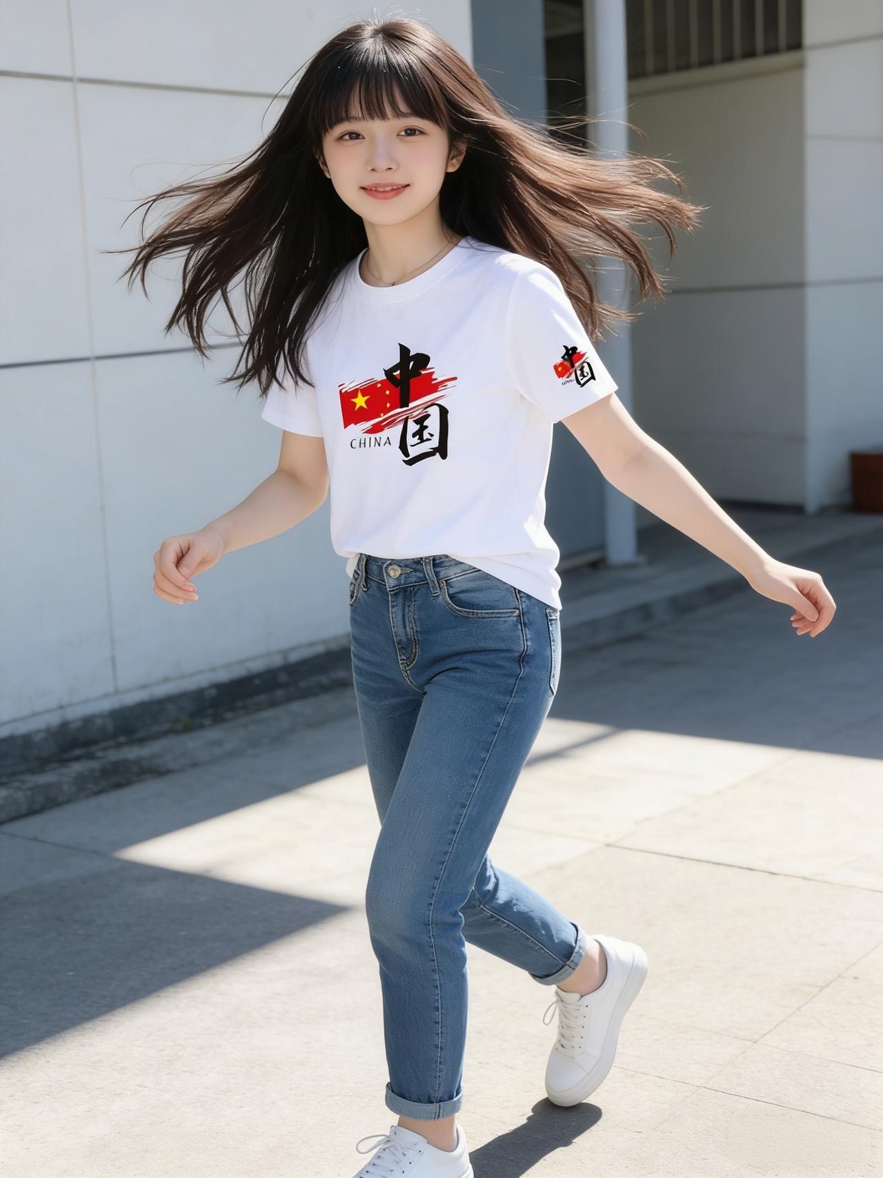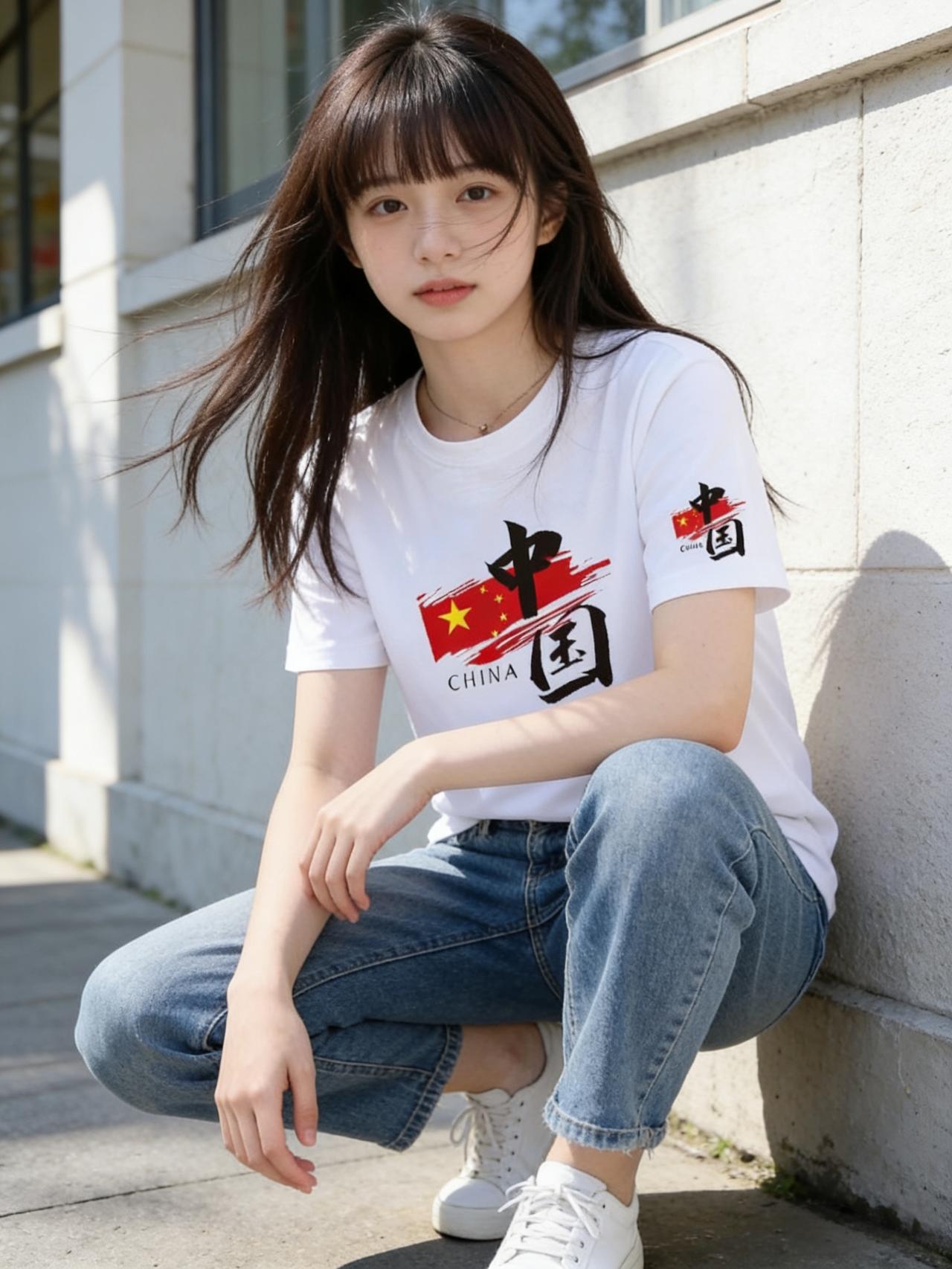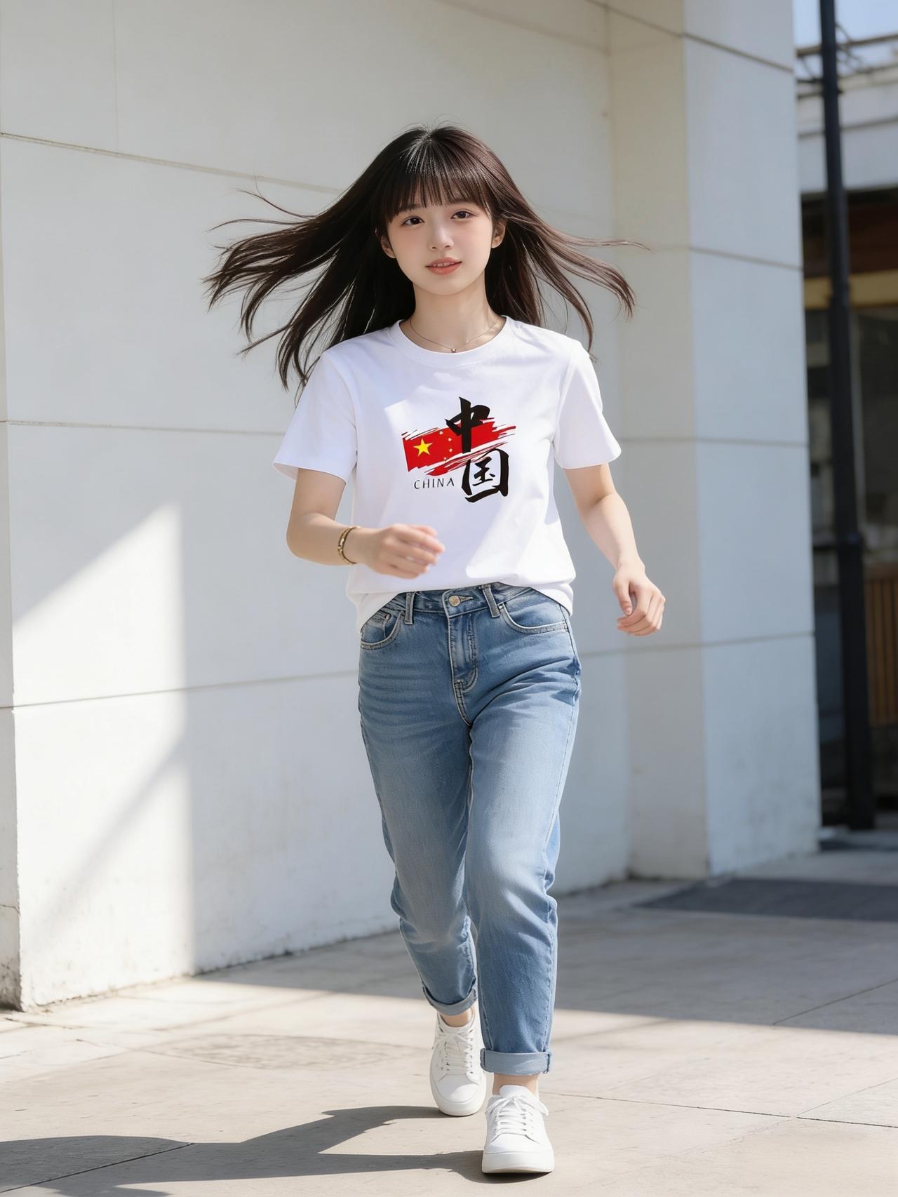 午后的阳光正好,她穿着一件纯白T恤走过街角,胸前的中国风图案格外吸睛——那是一抹写意的青绿山水,或是几笔遒劲的书法,将东方的雅致与现代的简约完美融合。下身搭配一条复古蓝牛仔裤,宽松的版型透着随性,裤脚随意卷起两道,露出纤细的脚踝。脚踩一双干净的小白鞋,每一步都轻盈得像踩在云朵上。她没有过多的修饰,只戴了一顶米色棒球帽,马尾从帽后探出,随着步伐轻轻晃动。女孩子怎么穿搭既时尚又好看? 女生穿搭如何又飒又美? 时尚穿搭