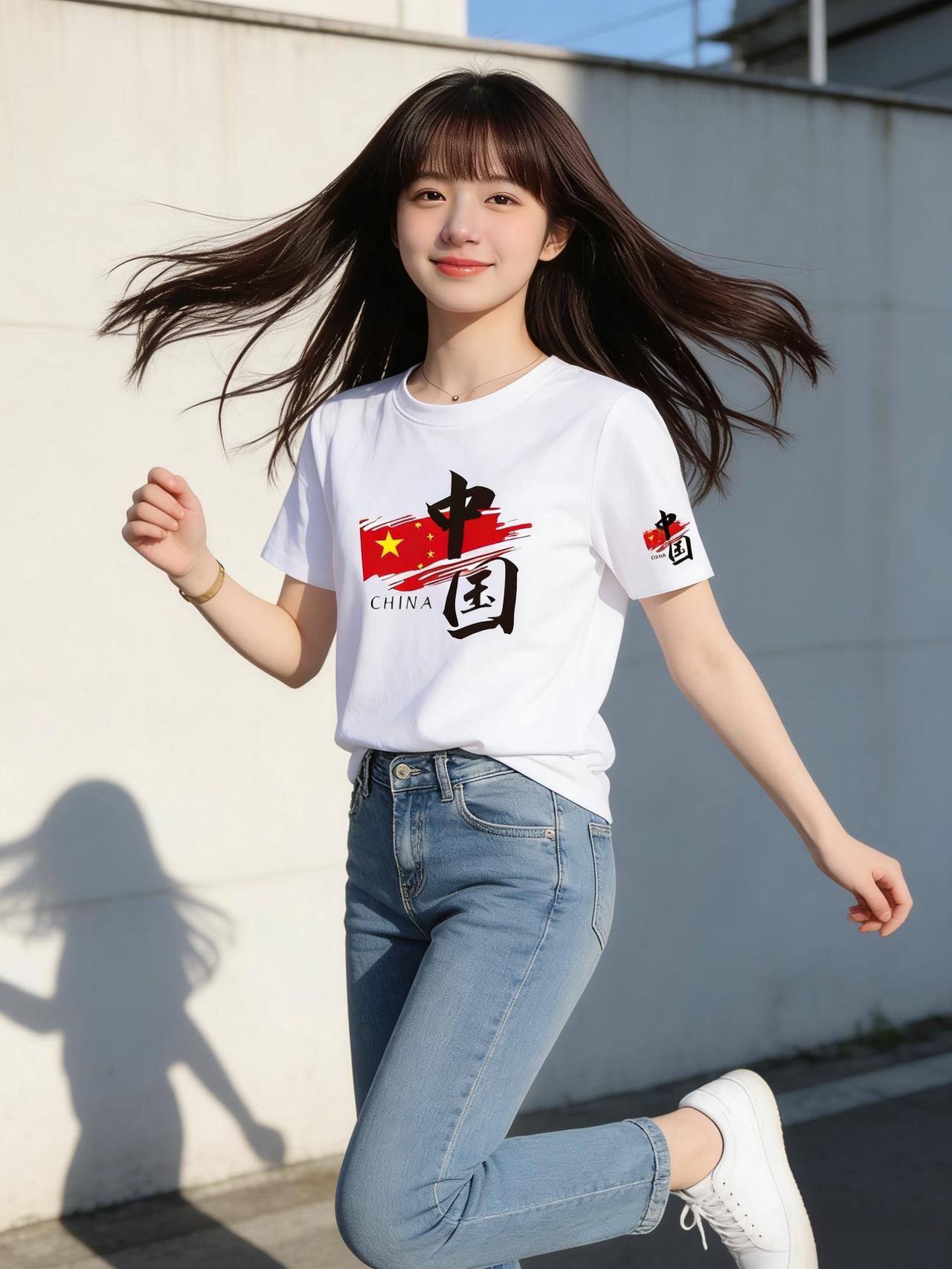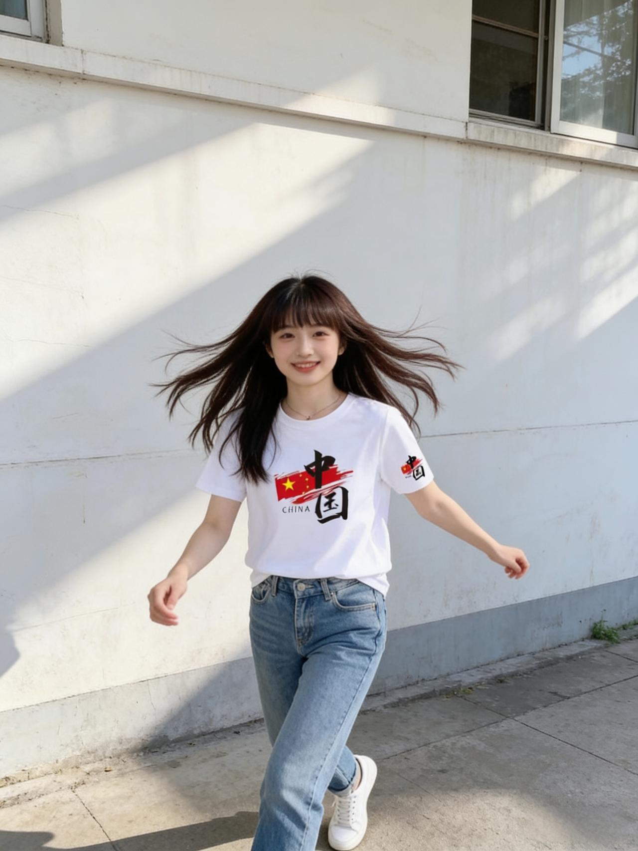午后的阳光正好,她穿着一件纯白T恤走过街角,胸前的中国风图案格外吸睛——那是一抹