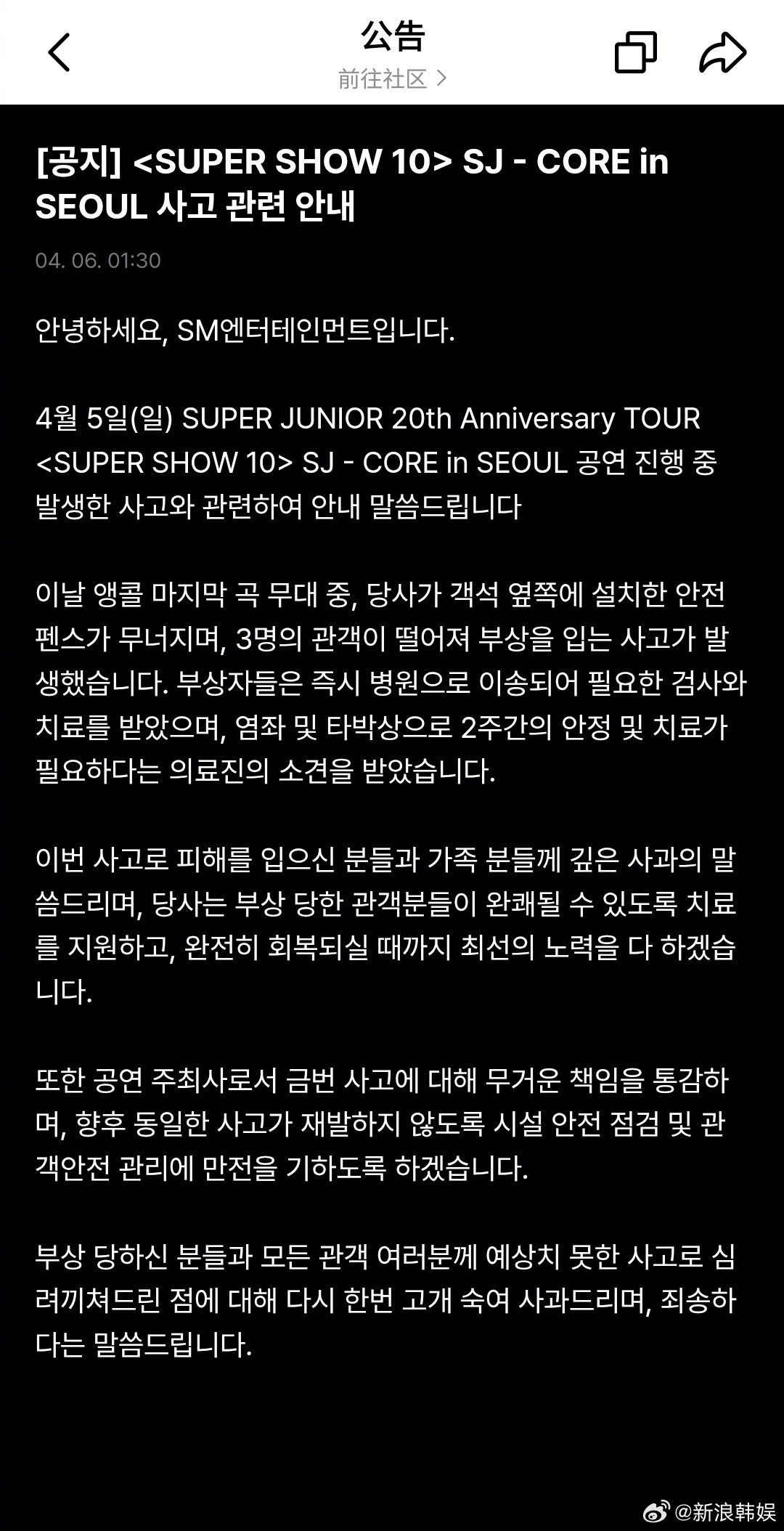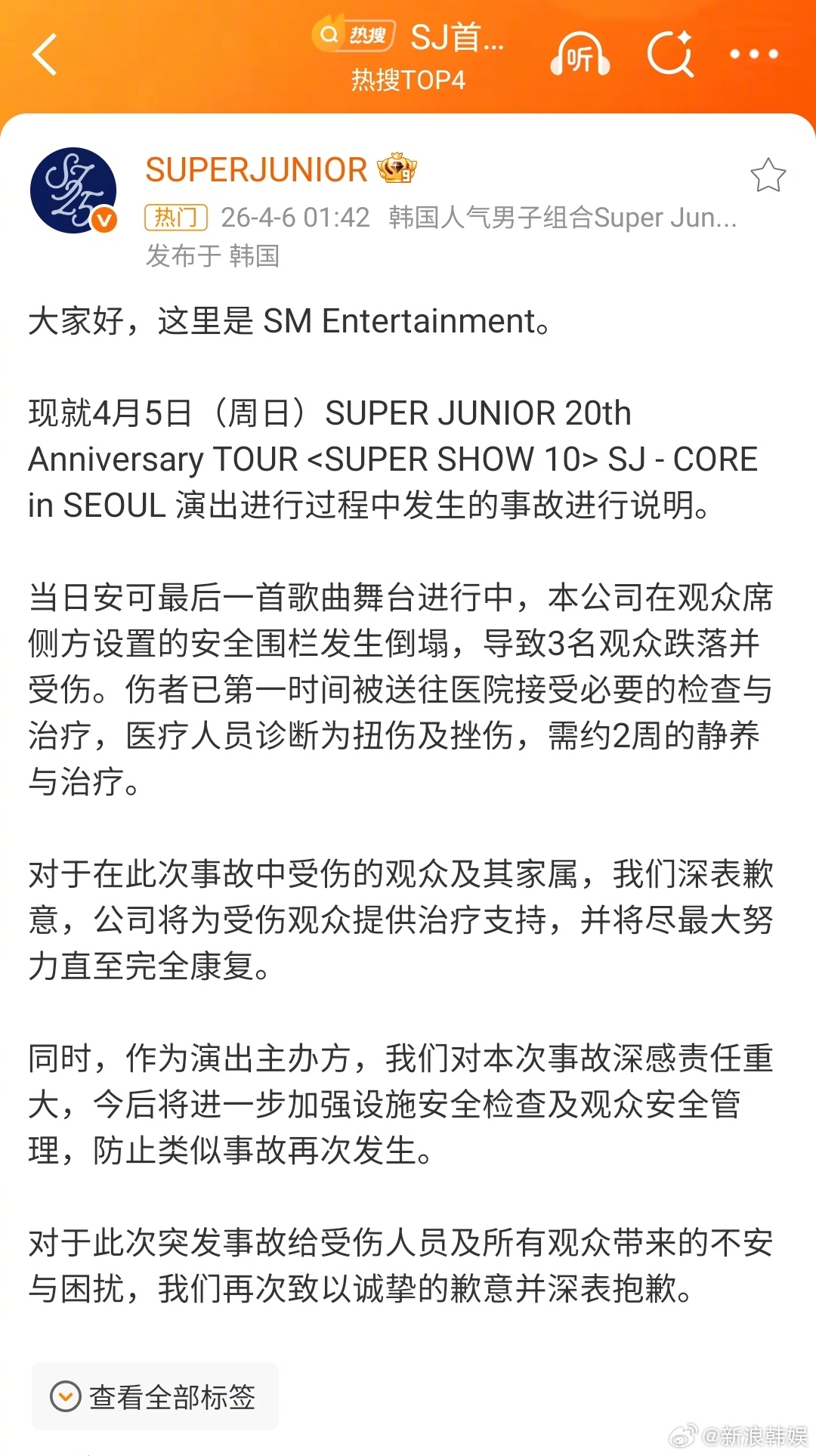 SJ首尔演唱会栏杆断裂粉丝坠落SJ道歉声明 4月6日凌晨,就演唱会观众从看台坠落事故道歉,“事故造成3名观众受伤,需要静养两周”,稍晚,受伤观众也发文报平安。据悉,SuperJunior首尔演唱会现场,因一层看台栏杆松动,3名观众从看台坠落。SJ演唱会事故3名观众受伤