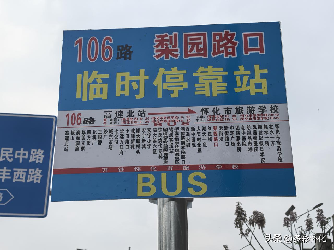 自4月6日起,怀化市梨园路正式开通公交车运行,106路公交车从怀化市旅游学校经梨园路至怀化北高速出口,沿途经过舞水一桥,纺织品市场,老中医院,团结派出所,梨园路口,红星桥,大美时光里,新中医院,湖南医药学院锦溪校区,锦溪客运车站,鸿大第六区,宏宇小学,宏宇新城,顺天路桥头,教师新苑,华远万江府,七公司,纱厂,三眼桥,华美立家等站。