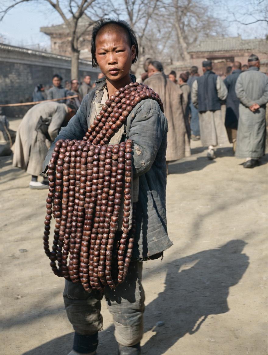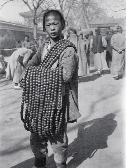 清末,北京街头的流动山楂小贩,背负着成串的山楂走街串巷叫卖,小贩用长绳将几十串糖葫芦串成巨大的串组背在身上,既方便走街串巷,也能让顾客一目了然挑选。 这位穿破旧粗布棉袄的少年,是清末北京的底层流动小贩,山楂小贩大多是破产农民、底层童工,没有固定摊位,靠走街串巷叫卖谋生,收入微薄,常年风餐露宿,是挣扎在温饱线上的劳动者。 清末底层小贩的生活极其艰辛,山楂是薄利的平民零食,小贩每天要走街串巷十几个小时,收入仅够勉强糊口,还要面对地痞勒索、严寒天气等困境。
