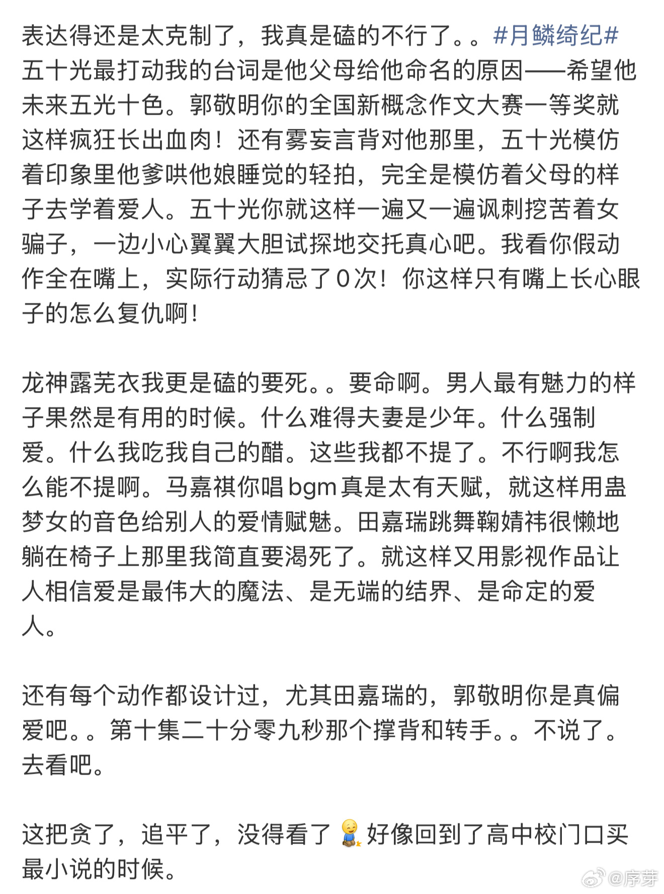假期一口气追平月鳞绮纪月鳞绮纪 被身边人疯狂安利月鳞绮纪,假期抽空追平后真的没失望,整体看下来很过瘾
