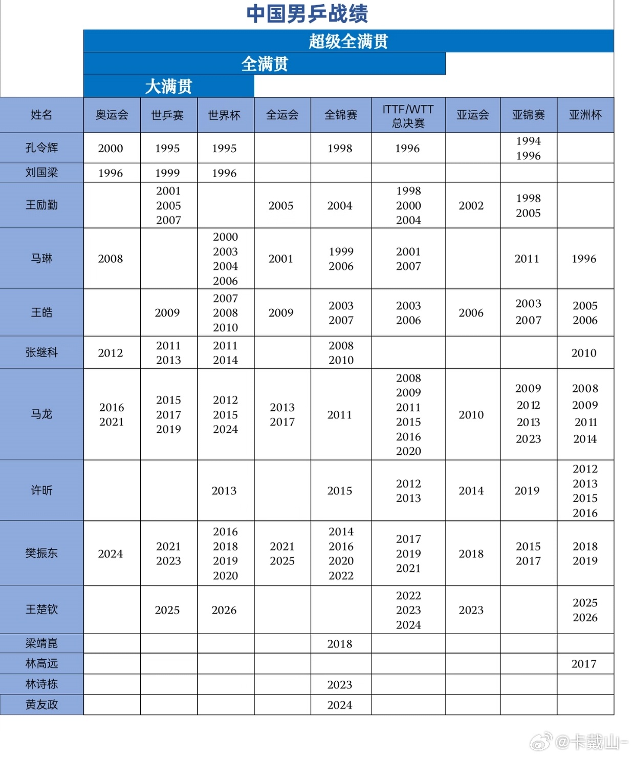 拉表了!王楚钦距离大满贯仅差奥运会~超级全满贯:马龙、樊振东全满贯:马龙、樊振东