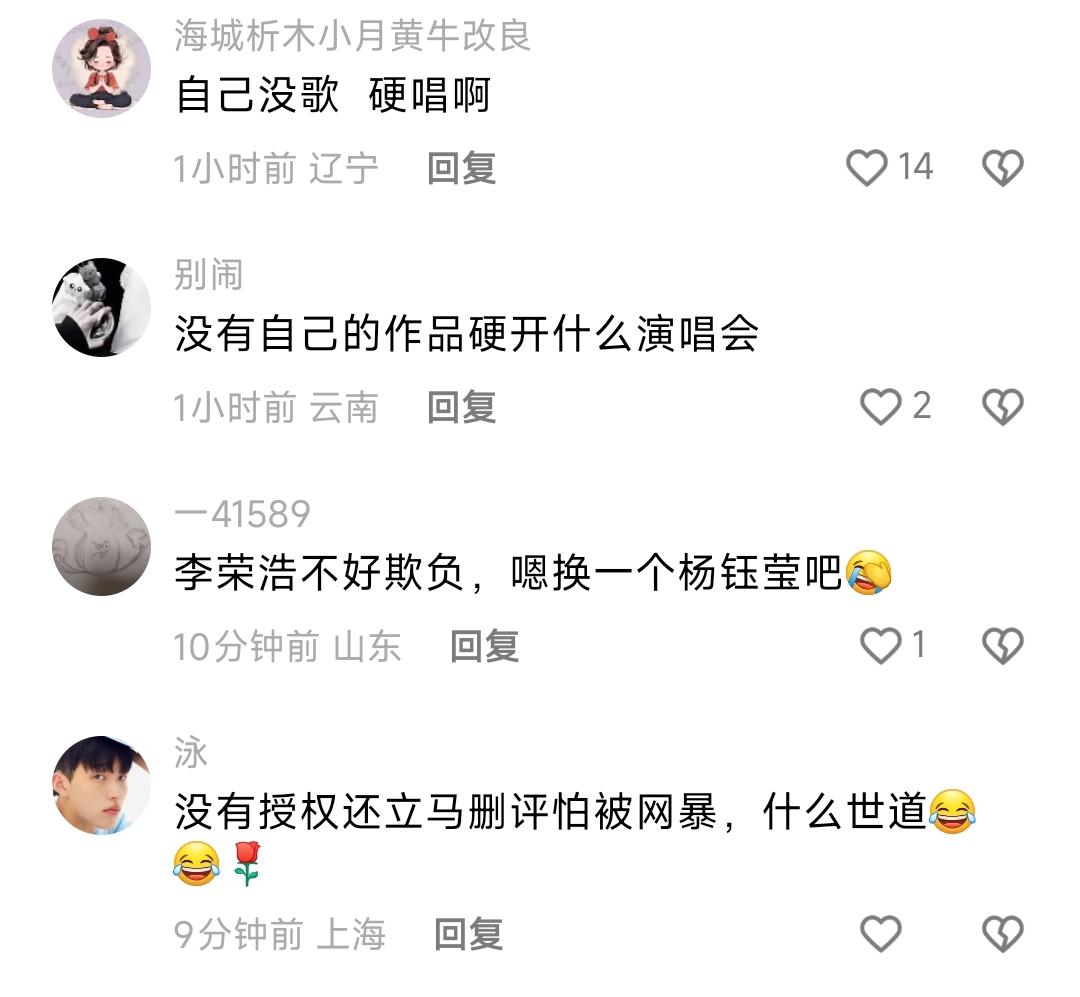 单依纯换的歌仍然没有授权,网友特地问了创作者 《李白》换成了《让我轻轻地告诉你》,网友特地问过,对方称没有授权,不过后面又删除了评论,可能怕被弄上热搜吧。 单依纯 真是应了那句:我错了,但我还敢。莫非网友扒出来的背景强大是真的? 网友:李荣浩不好欺负,嗯换一个杨钰莹吧[捂脸] 娱乐圈应该多一点李荣浩 这样敢说的。