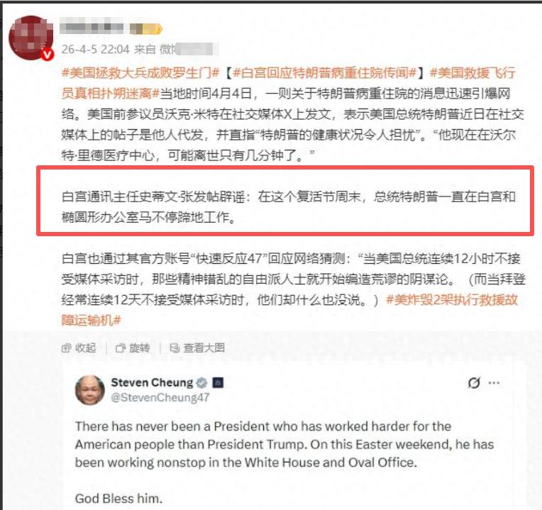 特朗普“消失”了? 他近日一直没有露面,网友说海外平台传疯了,特朗普可能出现了严重问题,阿拉伯媒体直接说他人没有了,而美国也有人认为关系密切的人士说特朗普出现了问题,但是白宫回应说特朗普好着呢,一直从白天到晚上熬夜工作! 不过,越是对比这种郑重辟谣,越让网友更想问一句:“那他到底去哪了?”这场信息拉锯战,成了典型的“全球级”猜谜局,光看热度就能感觉到:只要涉及特朗普,任何不那么寻常的小动作都不会轻易被忽视。 其实大家之所以这么敏感,和特朗普本人的“存在感”有关。他一直以来以高调著称,不论是卸任前后,只要有新闻或者热点他几乎都在场。 网上能看到他前脚发完动态,后脚在电视访谈或者集会上露面。他的账号一天能发出不止一条动态,这么多年来大家已经习惯了他的这套“公开日常”。 可一到了这次,突然几天没个影,只剩下偶尔被证实的几个场合,比如去高院待了一会儿、搞了次全国讲话,不像以前那样频繁出现在镜头前。这种反常,让很多网友一下子不适应,甚至有点没安全感。 很多人心里都有个疑问:这样高频的人物突然低调,会不会真的有点状况?其实公众对领导人健康和行踪异常的敏感,不是没来由。 特别是面对一位年纪八十的总统,美国历史上也罕有这样的“高龄决策者”还保持着高烈度的工作节奏,加上外界对总统健康状况本来就格外上心。这种特殊身份,让所有风吹草动都容易被放大。 大家担心,不只是一个人的身体,更在意这背后是不是会对国家事务或者国际局势带来变数。互联网时代,捕风捉影的内容太容易流传,一张没有来源的照片、一句“朋友的朋友说”,都能搅动起更大的疑惑。 一直以来,特朗普的健康状态就是大家热议的话题。之前只要有风吹草动,网络上总有人现成的“证据”,比方步态、细节照片、昔日就医传闻,很容易被重新拿出来说事。 这时候舆论的“确认偏误”就出来了,谁都有一点之前的看法,遇到什么事总愿意找点可以验证自己看法的“片花”,各种旧梗新用,把简单的原本就变成了复杂的推论链,最后变成网友间的集体发酵。 面对传闻,白宫的表态很快,强调特朗普没事,依然精神,工作照常。官方回应虽然速度挺快,内容却没多少新意,通篇就说“没毛病”,但没能拿出让大家信服的具体细节。 例如实景工作照,访问名单,健检报告……这些细致的信息不出现,网友肯定会觉得“缺口太大”。大家要的不是一句“他挺好”,而是更具体、具体到动作和行程的那种证据。 只要信息透明度没有跟上,一句简单的澄清很难消解公众的“悬疑”,甚至会因为细节太少反而被质疑“有所保留”。信息空缺就是舆论的温床,这一点在这次事件上表现得很充分。 另一个推波助澜的因素,其实是现在的信息传播环境。社交网络对于负面和有冲突的消息极度敏感,大家往往更爱点击和转发“出大事了”“出意外了”这些带有强烈情绪冲击力的内容。 相比日常、平平无奇的工作报道,传闻总能更快“起飞”。很多人其实没核对就随手转发,只是觉得“这瓜有劲”,容易感受群体参与感。这种“后真相”扩散,就是靠情绪当马车,舆论发酵速度远快于事实查证。 放大镜下,不光是白宫辟谣顶不住舆论节奏,一些网友更乐于服自媒体、社交帖子的爆料,而对主流媒体反而保持距离感和怀疑。 权威信息要有更高门槛才能被信服,普通渠道反而能用一句模棱两可的话走得更远。这样的氛围下,哪怕白宫每天都澄清,也不如一条“听说他出事了”传播得广。 这一点正好提醒大众,现在网络时代,每条信息都要多打几个问号,看它是不是经过多方核实,有没有可信出处,不然就可能被“谣言”牵着走。 归根结底,这场由特朗普短暂缺席引发的风波,其本质是社会对信息透明度和公众预期落差的不安。事件本身看似简单,但被反复放大的背后,是数字时代信息环境的复杂、急躁和网友的高敏情绪。 一场扰动,牵引出大家对健康、权力、甚至国家前景的连锁担忧。所幸后来特朗普再度公开露面发声,也让外界的传言慢慢消散。 或许对于每个关心现实的人来说,认清信息来源、保持警觉,减少情绪跟风,让事件本身多沉淀一下,比一味刷屏和猜测别人的行踪更能让我们安心。 世界本来就很复杂,关键时候别让不靠谱的小道消息带跑偏,稳住心态往前看,才是面对有限真相最靠谱的方式。 (信息来源:特朗普被传病重,被指“可能离世只有几分钟了”,白宫回应.......--潇湘晨报)