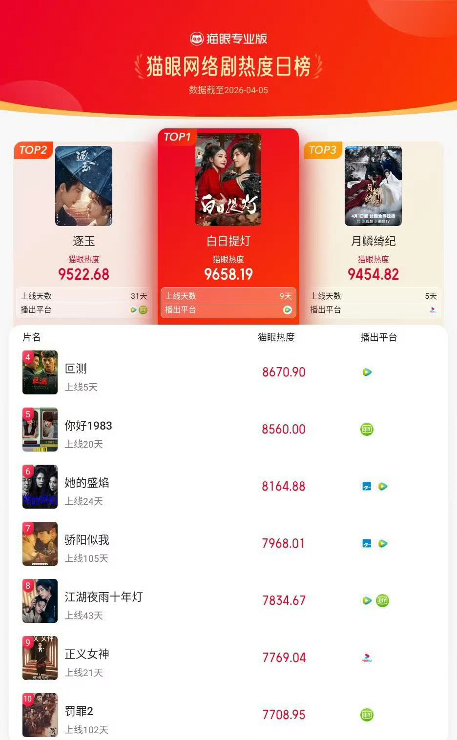 恭喜迪丽热巴《白日提灯》4.5日猫眼热度9658.19获日榜第一贺思慕角色v指数9.12登顶第一