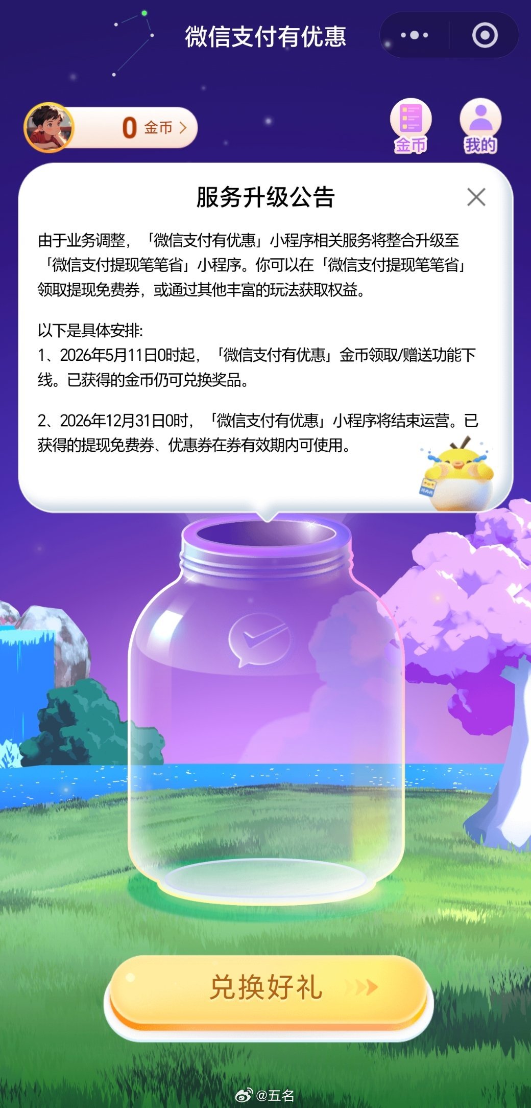 但是刚打开看了一下,貌似只是小程序关掉,由于业务调整,[微信支付有优惠]小程序相关服务将整合升级至[微信支付提现笔笔省]小程序。可以在[微信支付提现笔笔省] 领取提现免费券,或通过其他丰富的玩法获取权益。