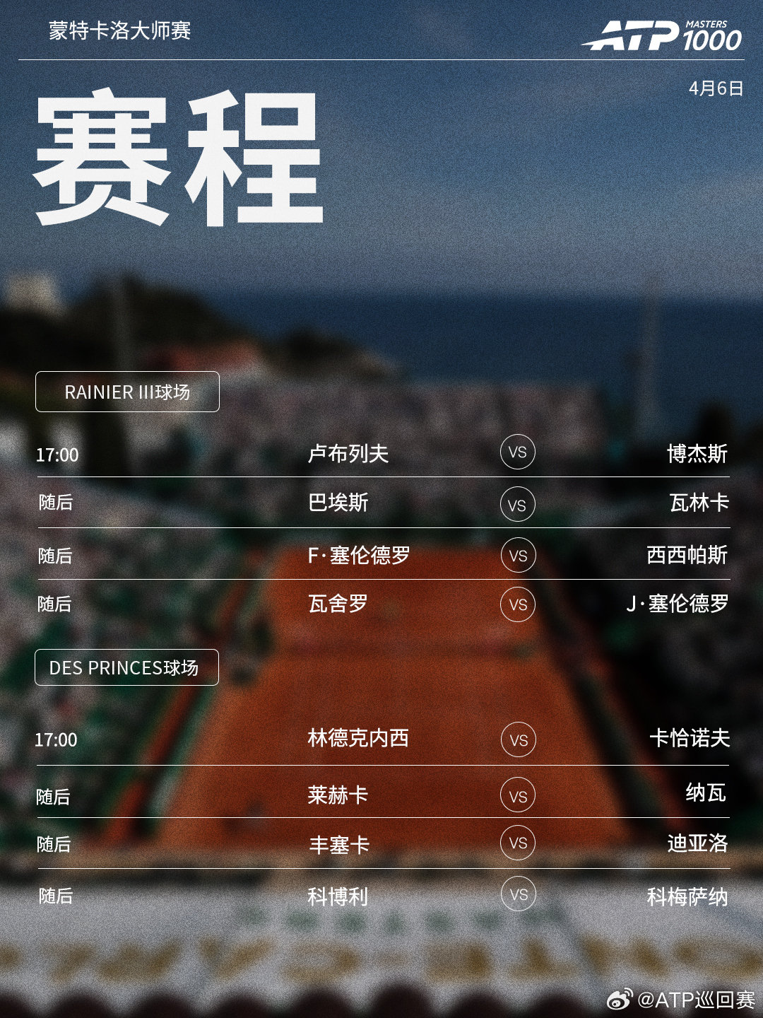 📍摩纳哥·蒙特卡洛🎾三位前赛会冠军卢布列夫、瓦林卡、西西帕斯先后出战中心场,瓦舍罗主场压轴亮相。