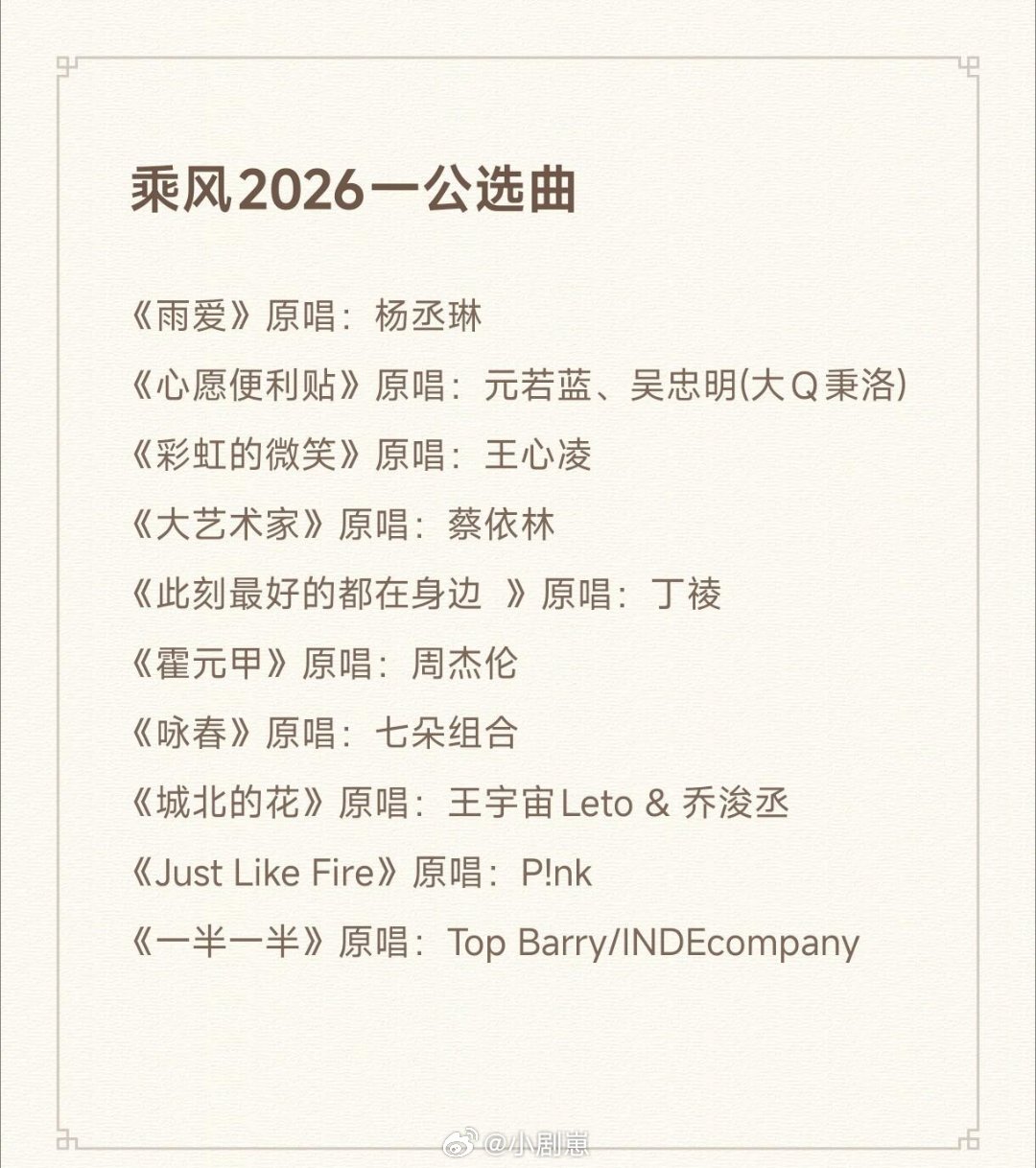 乘风2026一公歌曲,队长分组乘风2026一公团体曲目1.张月:陈瑶、徐梦洁、代斯《霍元甲》2.李心洁:谢楠、陈凯琳、徐洁儿《雨爱》3.叶一茜:范玮琪、侯宇、何宣林《城北的花》4.李小冉:唐艺昕、王濛《心愿便利贴》5.阚清子:张艺上、温峥嵘《咏春》6.庄法:江语晨、维妮娜《大艺术家》7.曾沛慈:黄灿灿、淡淡《一半一半》8.萧蔷:陶昕然、安崎《彩虹的微笑》9.乌兰图雅:者来女、万干惠《Just Like Fire》10.孙怡:张慧雯、赵子琪《此刻最好的都在身边》张月/代斯/陈瑶/徐梦洁~大跳特跳,简单夯爆了