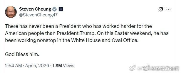 白宫通讯主任史蒂文·张发帖辟谣:在这个复活节周末,总统特朗普一直在白宫和椭圆形办公室马不停蹄地工作。