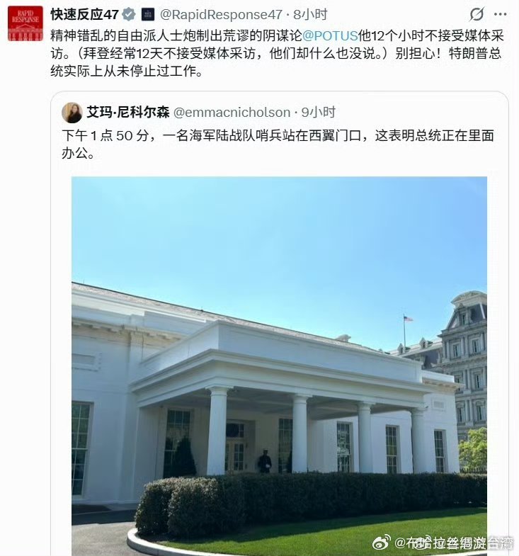 白宫也通过其官方账号“快速反应47”回应网络猜测:“当美国总统连续12小时不接受媒体采访时,那些精神错乱的自由派人士就开始编造荒谬的阴谋论。(而当拜登经常连续12天不接受媒体采访时,他们却什么也没说。)”