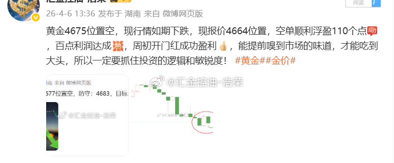 黄金4675位置空,现行情下跌至4648位置,空单止盈270个点,二百点利润落袋为安,每天都是机会,我只会把有把握的行情给到大家,因为我们目的只有一个,就是盈利!黄金金价
