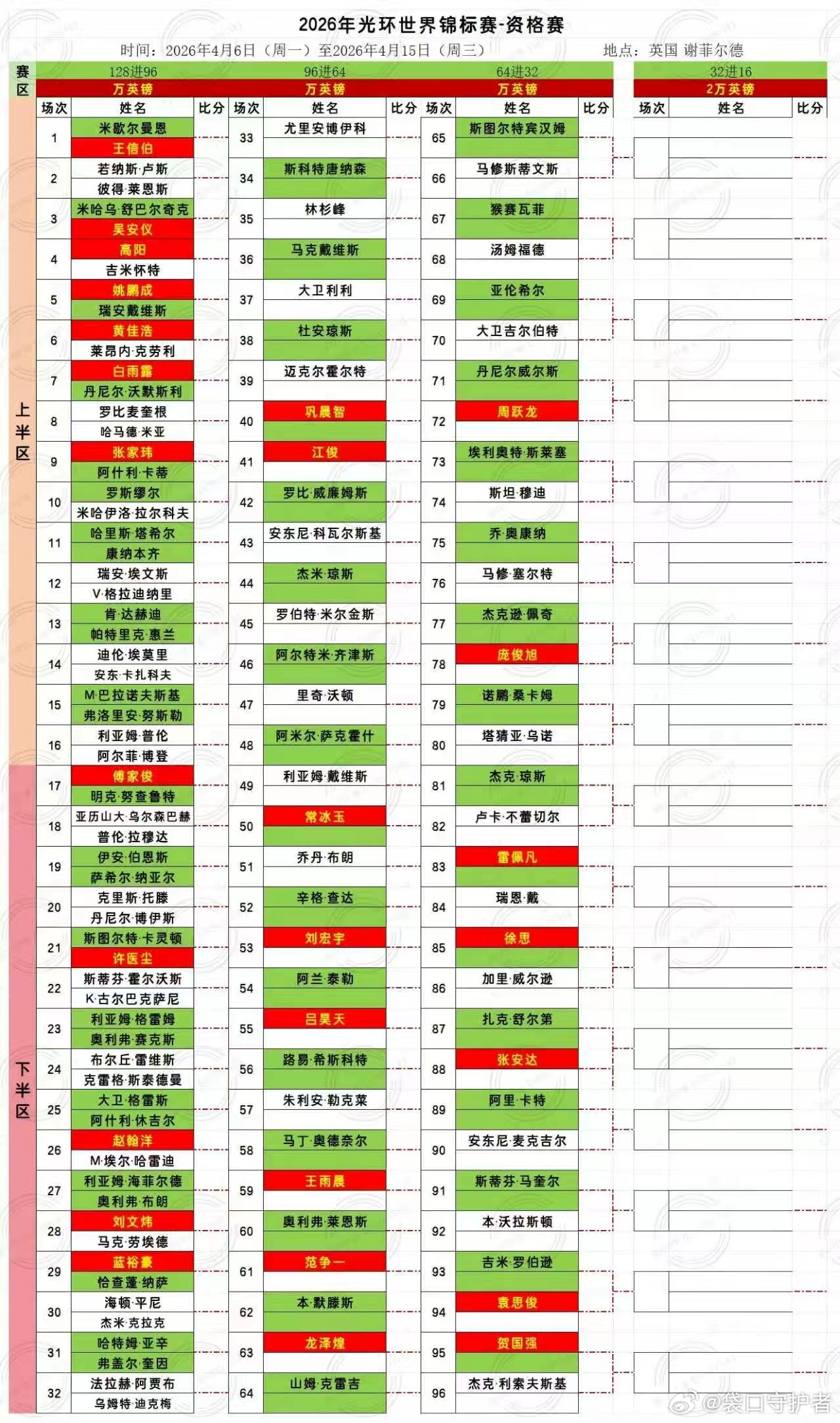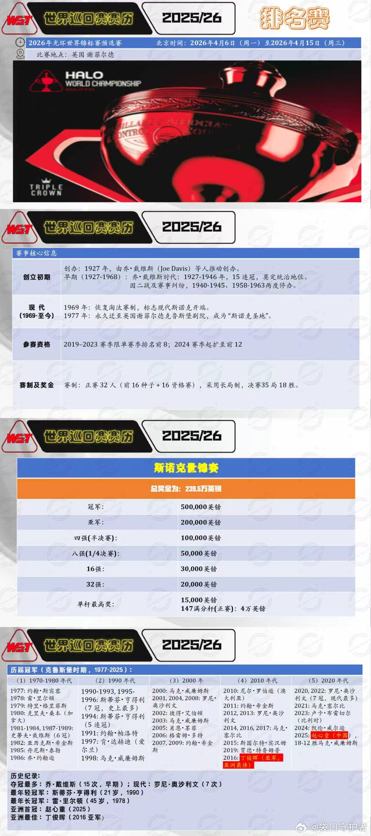 2026世界斯诺克世锦赛 今日开战2026.4.6日 星期一 19局10胜(9/10)17:00 直播: 王信伯VS米切尔曼恩 第一阶段 小窗:白雨露VS丹尼尔沃默斯利 第一阶段21:30 张家伟VS阿什利卡蒂 第一阶段