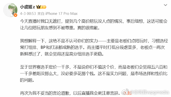 小虞姬为"高价陪玩没人点"言论致歉:口无遮拦我的锅近日,《英雄联盟》游戏主播、陪玩店老板小虞姬在直播时聊道陪玩行业,表示“部分高价陪玩没人点单”和“世界赛选手定价一千不被市场接受”。随后小虞姬在个人微博就此番言论致歉。全文如下:今天直播时我口无遮拦,提到几个高价陪玩没人点的情况,事后细想,这话可能会让几位陪玩朋友感到不被尊重。真的很抱歉。我想解释一下,这绝不是不认可你们的实力——主要是老板们点陪玩时,习惯选经常打组排、BP和打法都成熟的选手。而主播平时打低分段虐菜多,老板点一两次新鲜感过了,就会觉得还是高分组排选手更稳。至于世界赛选手定价一千多,不是说你们不值这个价,而是老板们会觉得五六百和一千多差距没那么大,没必要多花那个钱。这不是实力问题,是市场选择和性价比的问题。再次为我不妥当的言论道歉,以后直播我会更注意言辞。