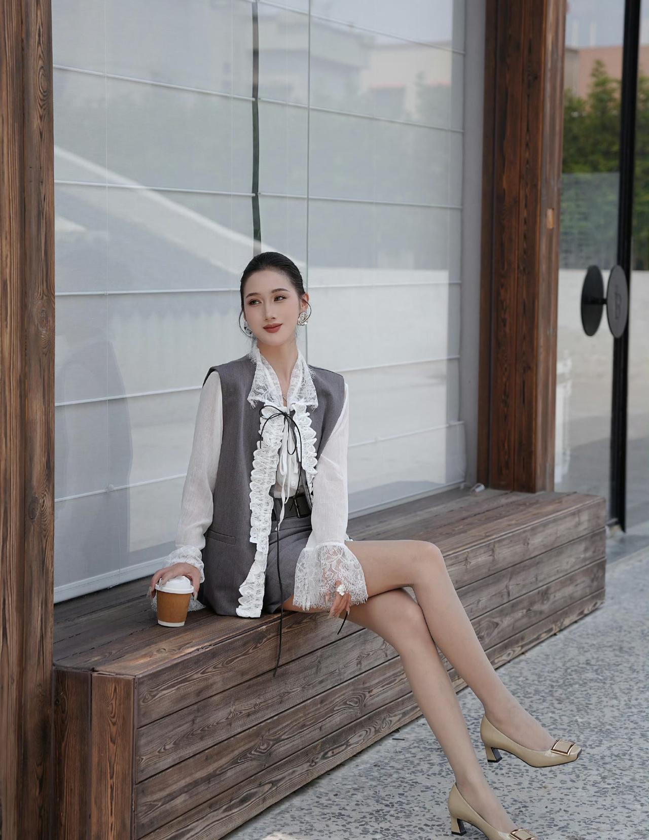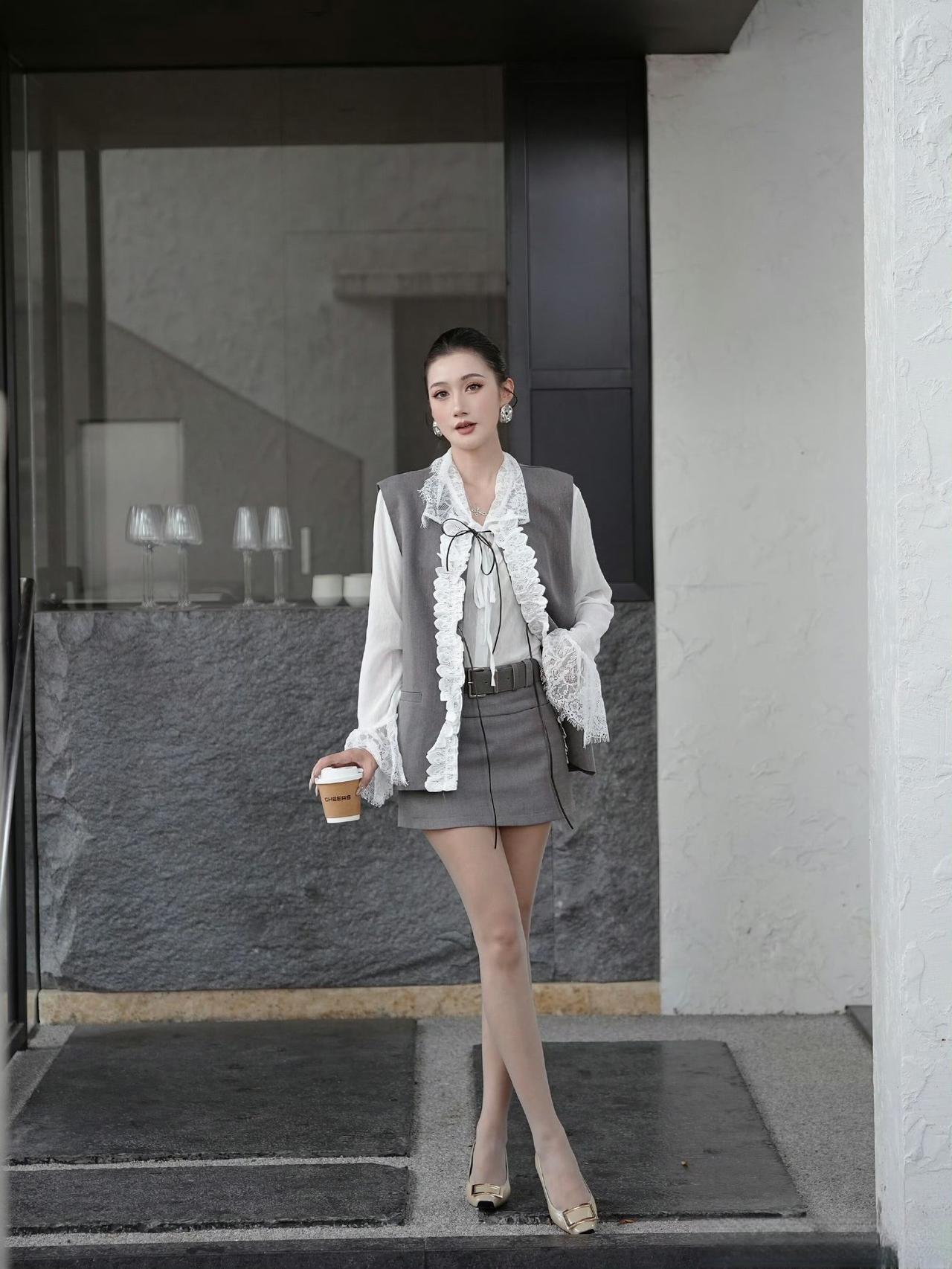 这套穿搭是“优雅复古+精致细节”的组合,自带高级氛围感: - 内搭选了白色蕾丝衬衫,蕾丝花边+系带设计充满复古甜美元素,喇叭袖增加了柔美感; ​ - 外搭灰色无袖马甲,简约的版型中和了蕾丝的柔美,边缘的蕾丝装饰又和内搭呼应,提升了整体的精致度;下装搭同色系灰色短裙,统一色调让造型更协调利落; ​ - 鞋子用浅棕金属扣高跟鞋,精致的鞋饰和整体的优雅风格适配,让造型更完整。 这种“蕾丝内搭+同色系马甲+短裙”的搭配,既保留了女性化的柔美,又有简约的利落感,很适合轻熟风的日常通勤或下午茶场景。温柔蕾丝穿搭 蕾丝风穿搭