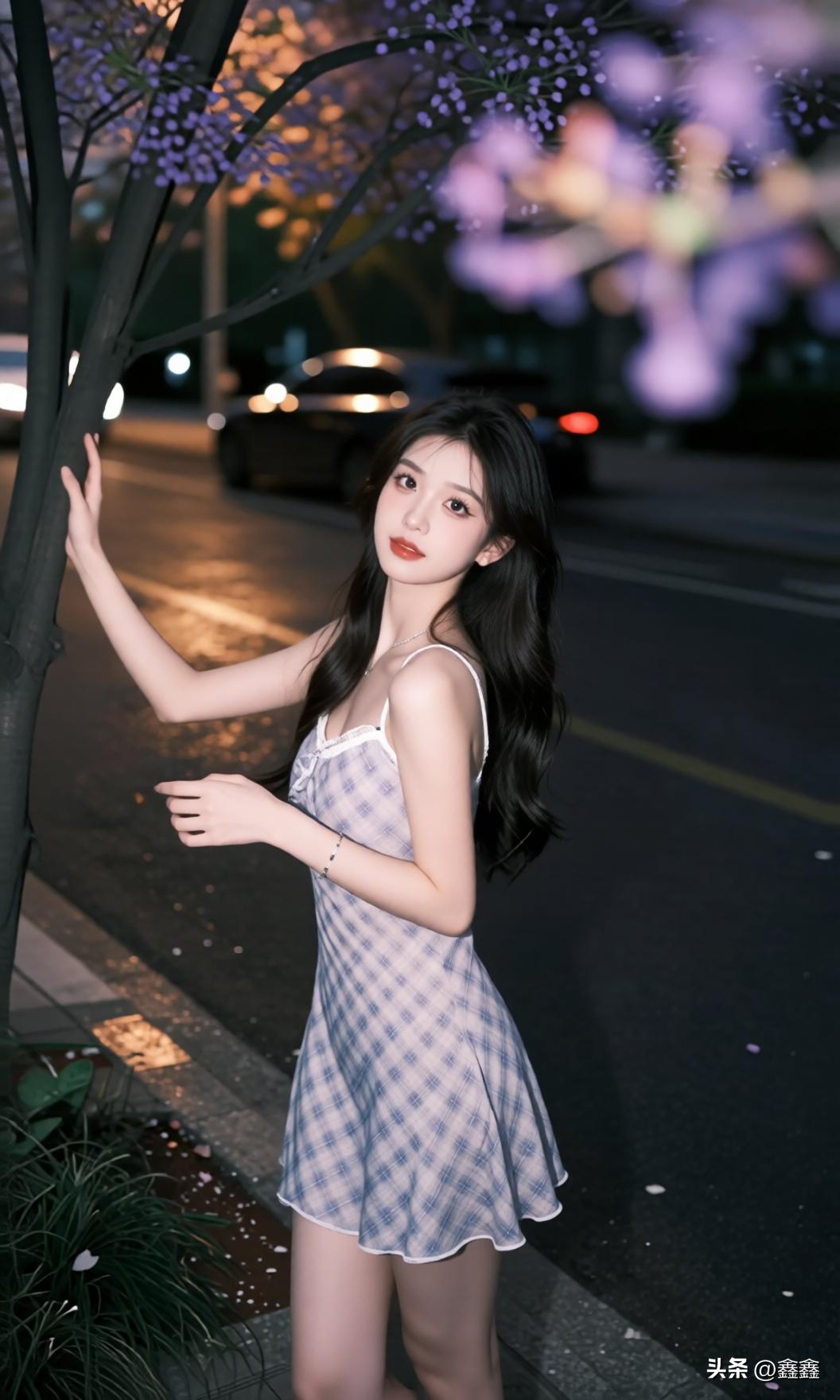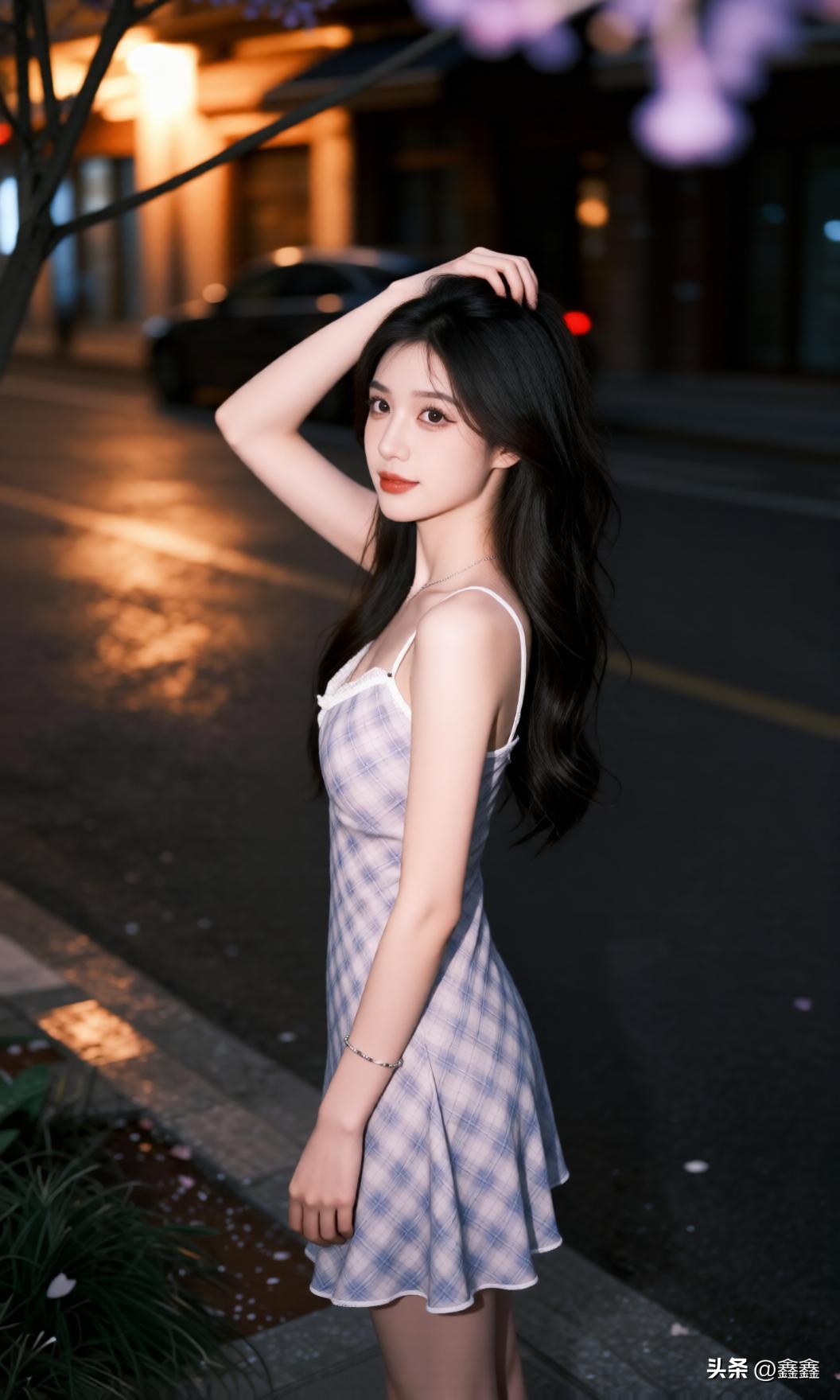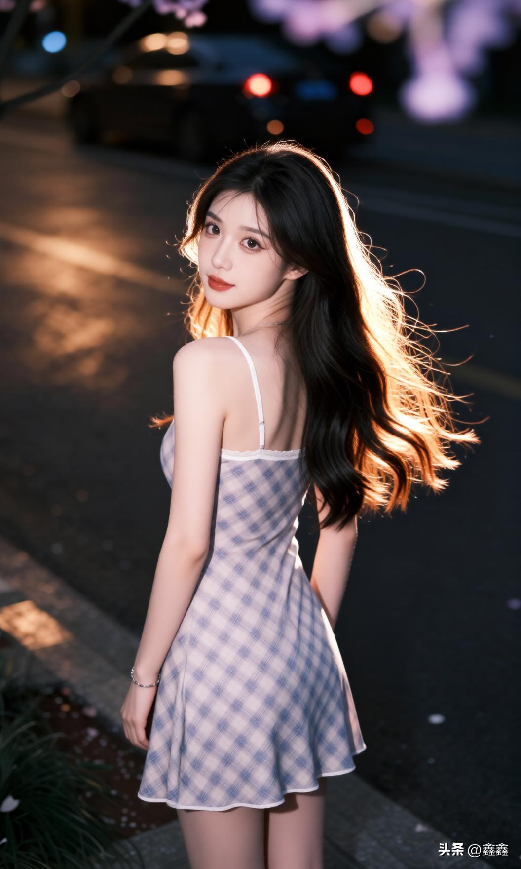 夜晚街头的甜美少女,裙摆轻扬,笑靥如花。