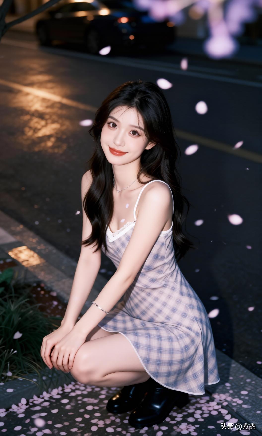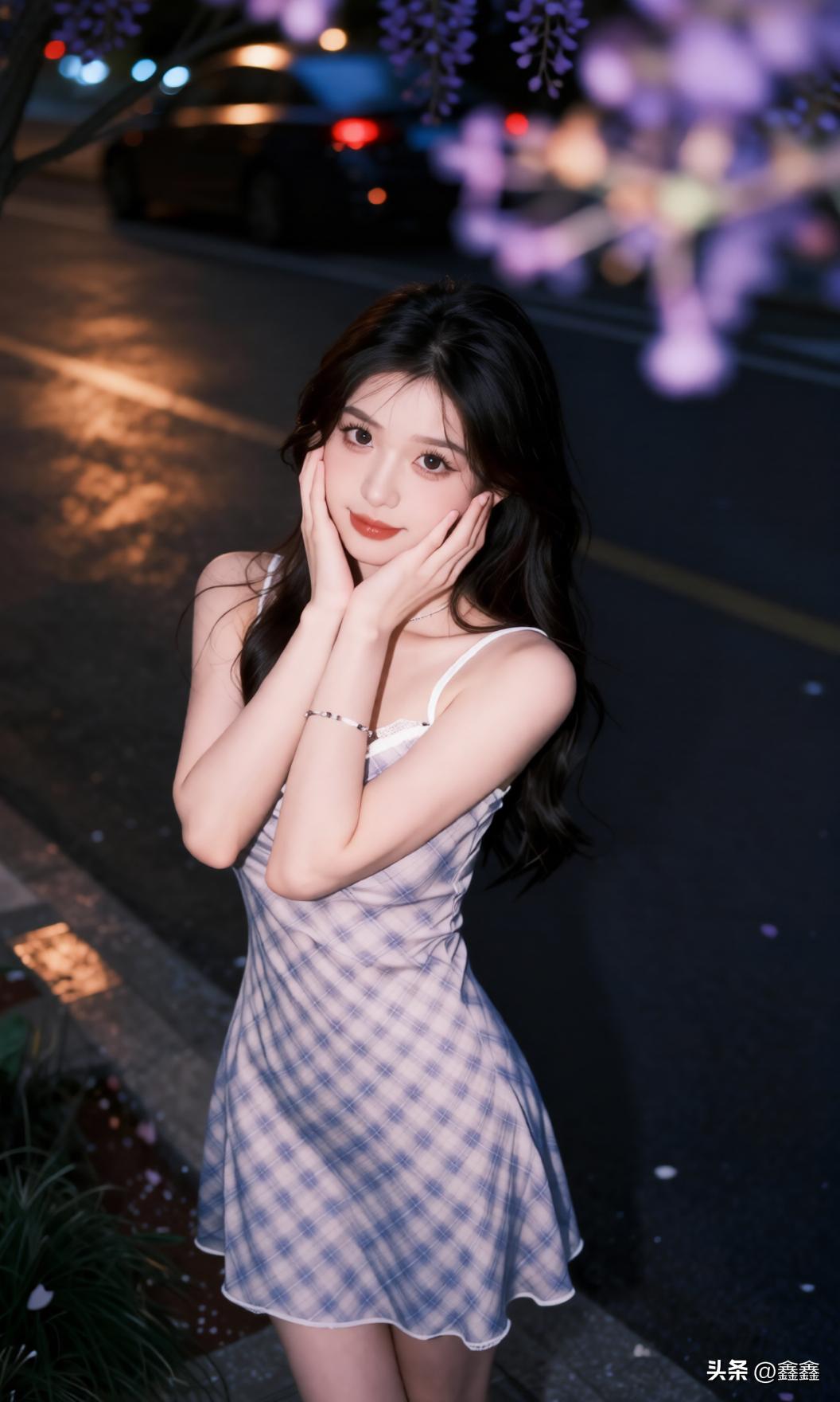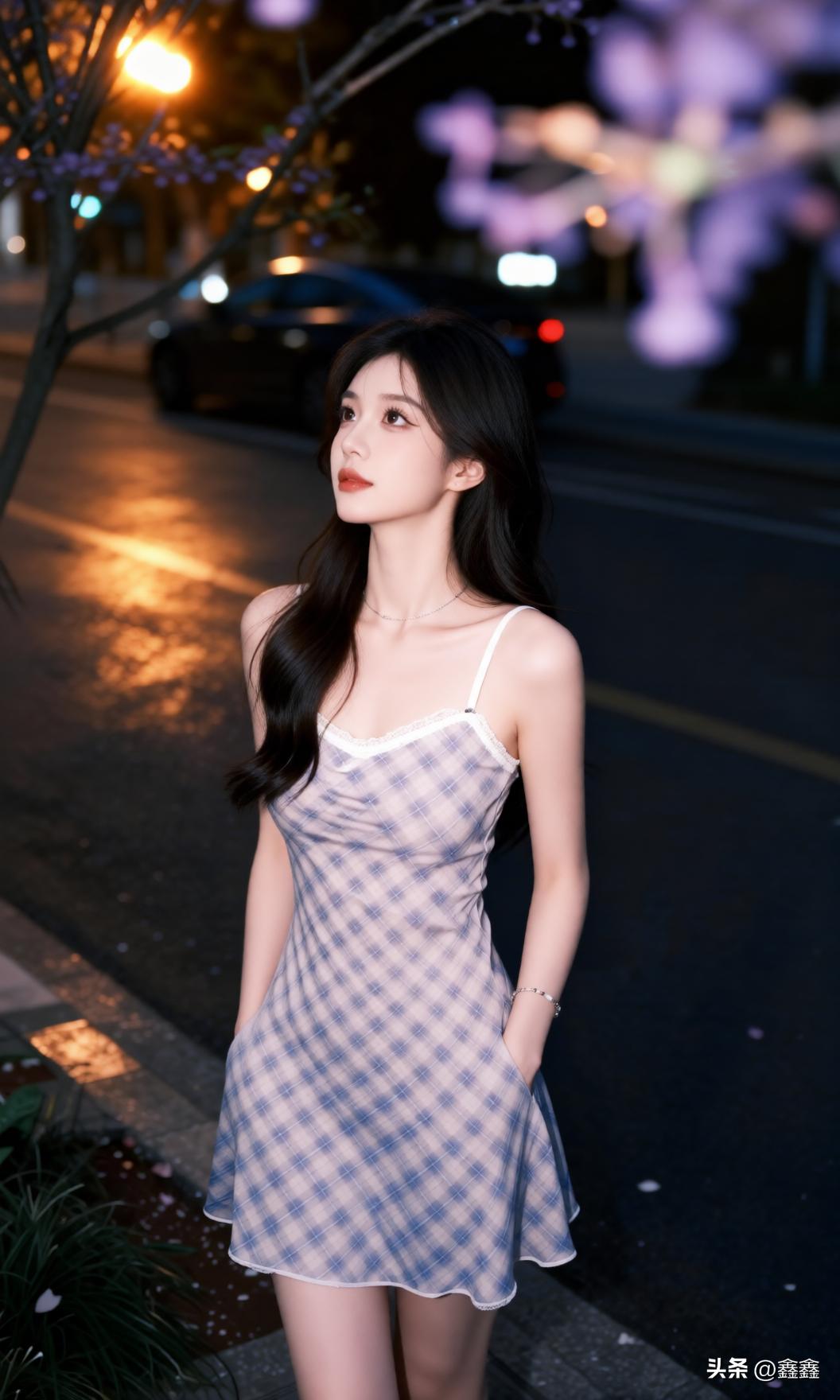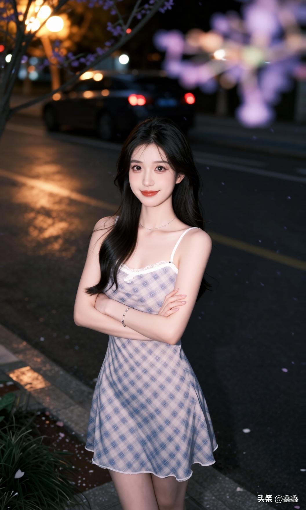 夜晚街头的甜美少女,裙摆轻扬,笑靥如花。