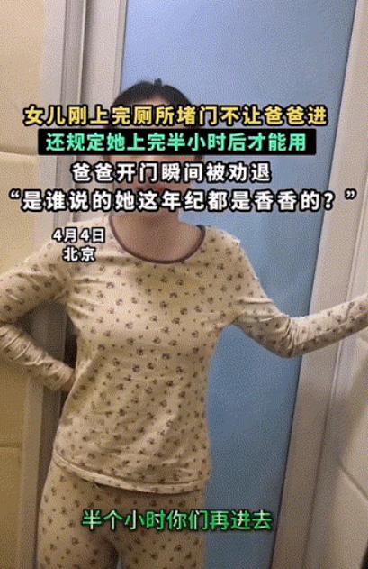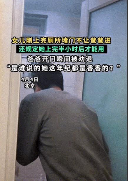 4月4日,北京。女儿刚上完厕所堵门不让爸爸进,还规定她上完半小时后才能用,爸爸开门瞬间被劝退,“是谁说的她这年纪都是香香的?” 。 说白了,养女儿就是一场“大型真香翻车现场”,前一秒还觉得她是浑身带香的小天使,下一秒就被她的“厕所禁令”熏得怀疑人生,顺带刷新对“小女生”的所有美好想象。 4月4日北京的这位爸爸,就实实在在体验了一把这种落差,被自家闺女的操作整得又气又笑,全网看了都直呼“过于真实”。 事情很简单,女儿刚上完厕所,没等家人进去,就直接堵在了厕所门口,小手叉腰,态度特别坚决,明确规定“我上完半小时,你们才能用”。 爸爸一开始还觉得好笑,心想小丫头片子还挺有主意,压根没当回事,毕竟在他眼里,自家闺女不管多大,都是那个需要他抱、需要他哄的小不点,哪能真跟他讲“规矩”,可他没想到,女儿是来真的,任凭他怎么软磨硬泡,就是不让步,急得他直跺脚。 其实懂的人都知道,这姑娘哪是故意刁难爸爸,说穿了就是怕破坏自己在爸爸心里的“香香形象”。 我们都能理解,小女孩一旦长到有自我意识的年纪,就特别在意别人对自己的看法,哪怕对方是一把屎一把尿把自己养大的爸爸,也不想让他闻到自己拉的臭味,更不想被爸爸嫌弃。 这不是矫情,是孩子长大了,有了自己的小隐私,哪怕是最亲近的父母,也得学着尊重这份小小心思,毕竟孩子的自尊心,从来都不是小事。 说到厕所的臭味,我倒想多聊两句,很多人都觉得屎都一样臭,其实不是这样的。 我感觉,屎臭不臭,关键看排便频率,一般一天固定在早晨排一次的,味道都不会太大,毕竟食物在肠道里停留时间短,没来得及充分发酵。 可要是三五天甚至一周才排一次,那味道可就不一样了,屎在肠道里被细菌反复分解发酵,拉出来的味道能瞬间弥漫整个卫生间,熏得人直皱眉,据说肠道菌群多的人,这种发酵后的臭味会更明显。 就像我家,为了应对厕所异味,哪怕是大冬天,也得开半扇窗户,不然那味道能在屋里飘大半天,怎么散都散不去。 而且我家也只有一个厕所,这种尴尬就更常见了,有时候孩子在厕所里待久了,我们大人憋不住,只能轻轻敲门,好言好语让孩子快点出来,从来不敢硬闯。 更有意思的是,我家孩子跟北京这位小姑娘一样,每次从厕所出来,也不让我们立刻进去,非得在门上堵个5分钟,说是要让味道散散,生怕我们闻到,现在想想,这大概就是小孩子的小心思吧。 再说回北京这位爸爸,实在憋不住,趁女儿不注意,一把推开了厕所门,结果刚探头进去,就被一 股浓烈的臭味熏得立马退了出来,还忍不住吐槽:“是谁说的她这年纪都是香香的?” 其实不光是他,很多家长都有过这种体验,总觉得小女孩就该是干干净净、香香甜甜的,却忘了,不管多大的孩子,都是普通人,都会有正常的生理需求,也会拉臭臭、有异味。 我家孩子上厕所也有个习惯,拉出屎的一瞬间就先冲水一波,她说这样能减少臭味,而且整个上厕所期间,至少要冲三次水,一次都不落下,有时候冲完还会特意闻闻,确认没味道了才肯出来。 我一开始还觉得她浪费水,后来想想,这也是孩子在意形象的一种表现,也就顺着她了。 其实不管是堵门不让进,还是频繁冲水,本质上都是孩子成长过程中的小变化,是她们有了自我意识、懂得在意形象的表现,我们做家长的,既要记得自己是看着孩子长大的,不用过分在意这些小细节,更要学会尊重孩子的小隐私,毕竟孩子长大了,就有了自己的小世界。 以上仅为我个人看法,不代表所有人的观点,不知道你们家孩子上厕所有没有什么特别的小习惯?有没有被孩子的这些小操作整得又气又笑过?欢迎在评论区聊聊你们的经历。