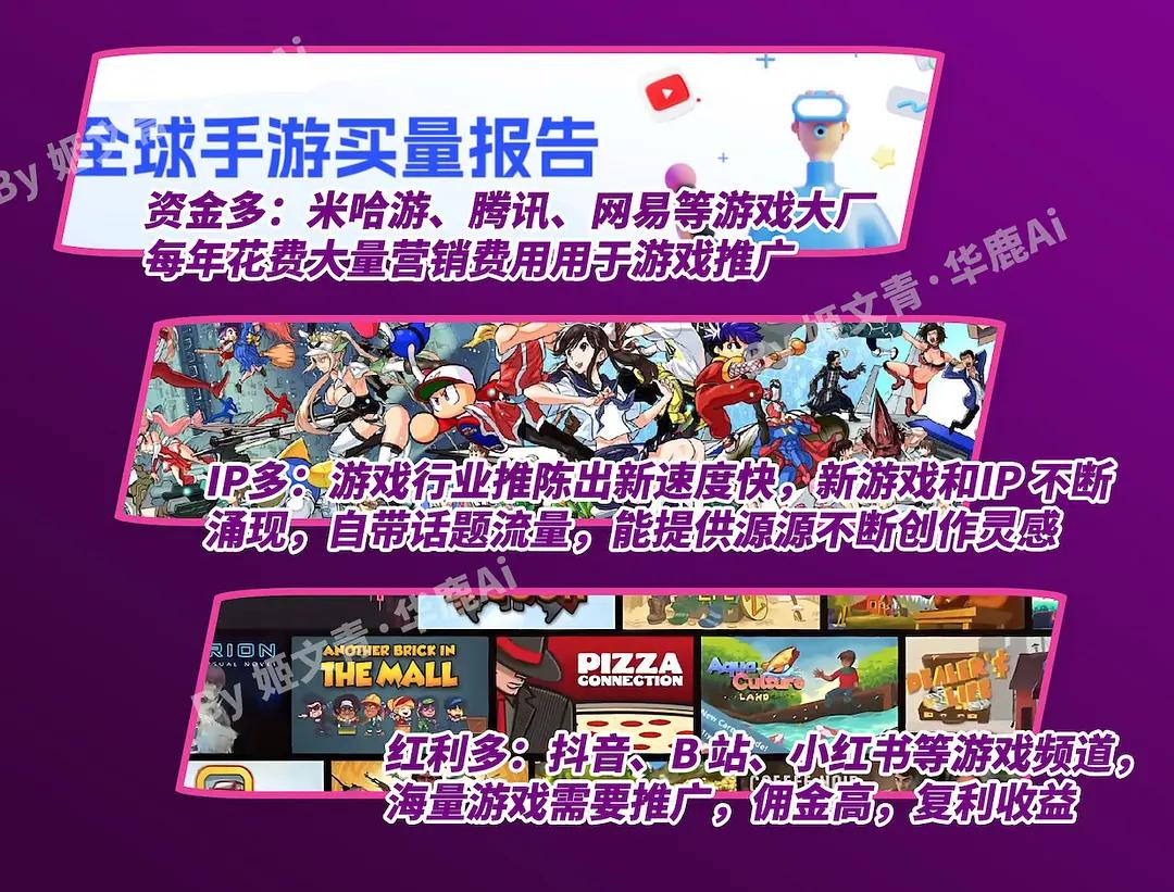 ·抖音、B 站等平台的游戏引流——只要有新用户通过你的视频进入游戏,就能拿佣金,用户在游戏内消费,你还能享分成