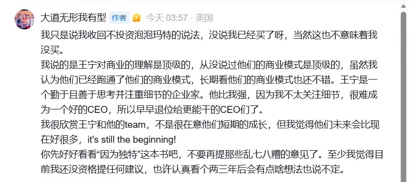 之前说看不懂,之后也没见他做过任何深度研究。去两家门店,站一小时,回来就下结论。这要是能叫投资研究,那每个去泡泡玛特买盲盒的小孩都是投资大师。