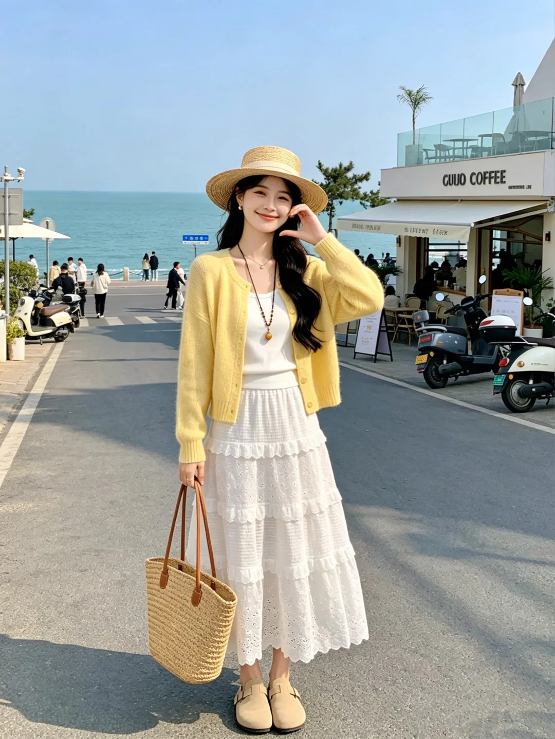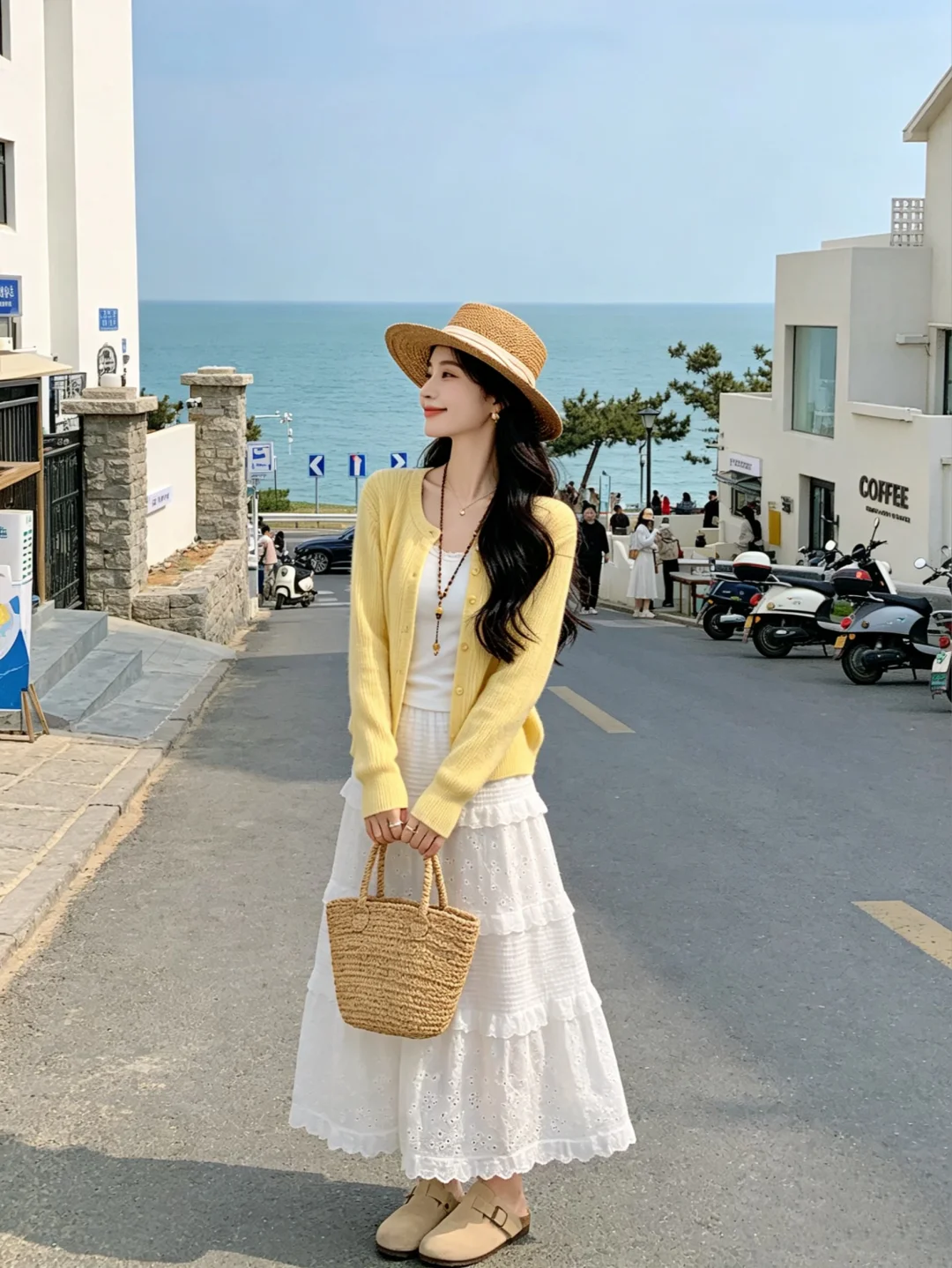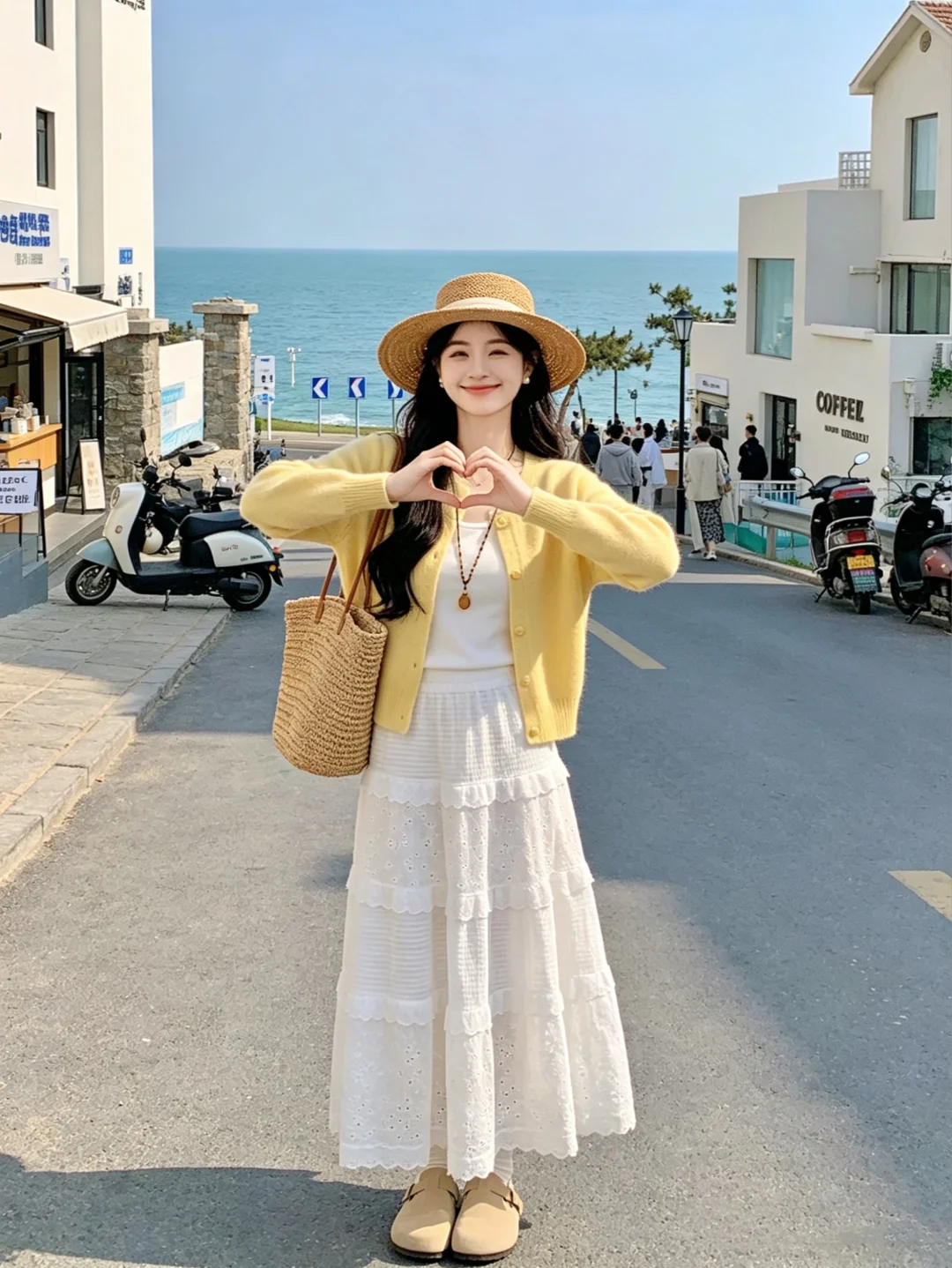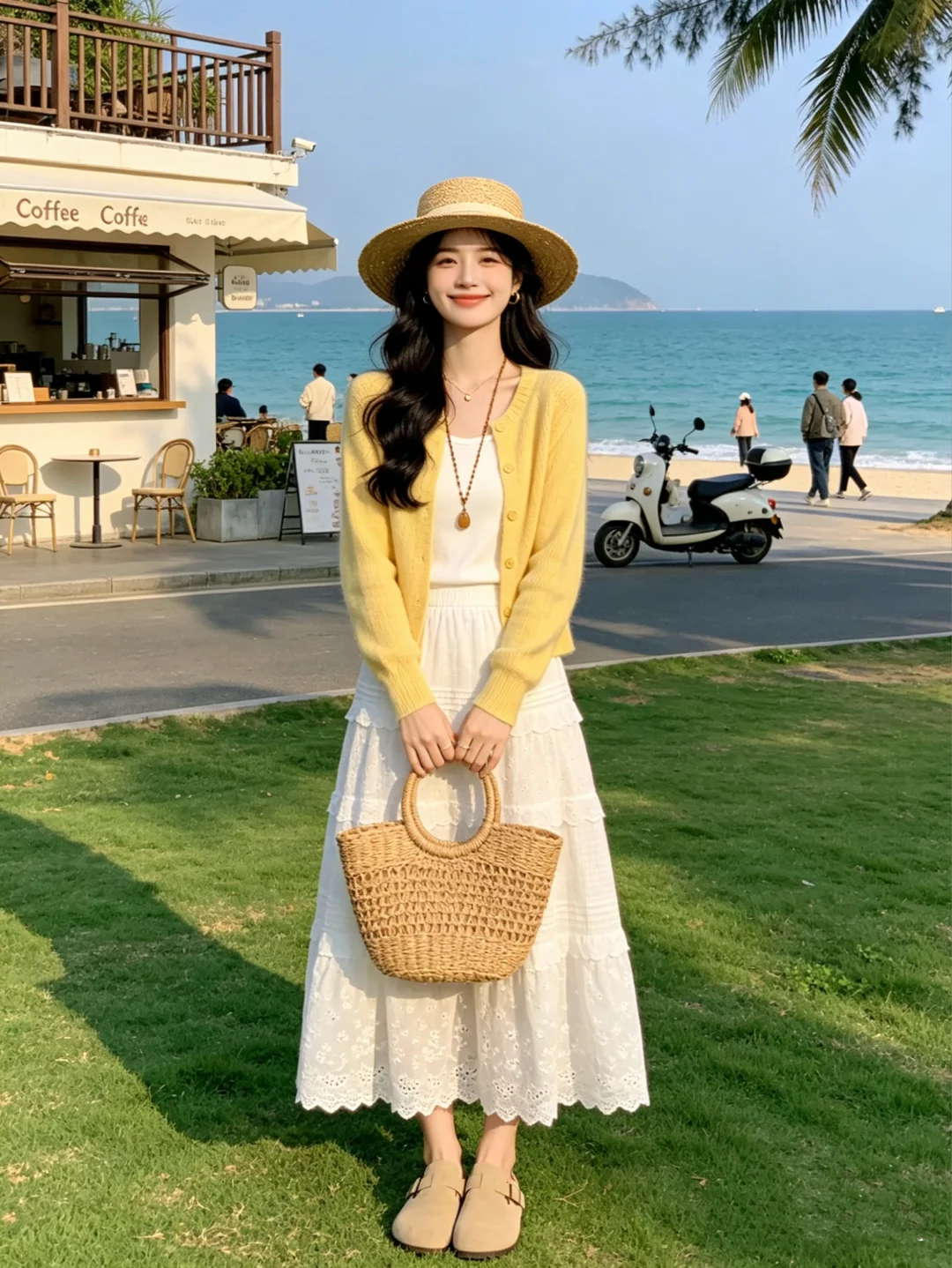 温柔穿搭风 喜欢一切明媚的人和事物 永远乐观自信永远积极向上 针织衫 白色半裙 蕾丝裙 海边拍照 海边穿搭 ootd穿搭 我们在世上是为了感受阳光