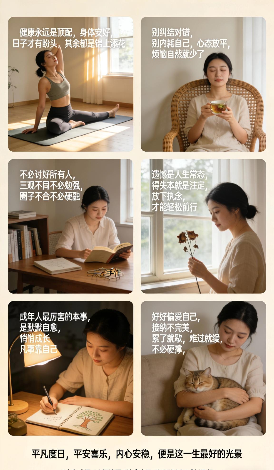 越长大越清醒,慢慢读懂生活最朴素的真相✨ 1. 健康永远是顶配,身体安好,日子才有盼头,其余都是锦上添花。 2. 别纠结对错,别内耗自己,心态放平,烦恼自然就少了。 3. 不必讨好所有人,三观不同不必勉强,圈子不合不必硬融。 4. 遗憾是人生常态,得失本就是注定,放下执念,才能轻松前行。 5. 成年人最厉害的本事,是默默自愈,悄悄成长,凡事靠自己。 6. 好好偏爱自己,接纳不完美,累了就歇,难过就缓,不必硬撑。 平凡度日,平安喜乐,内心安稳,便是这一生最好的光景❤️ 人生感悟 人间清醒 治愈自己 好好生活