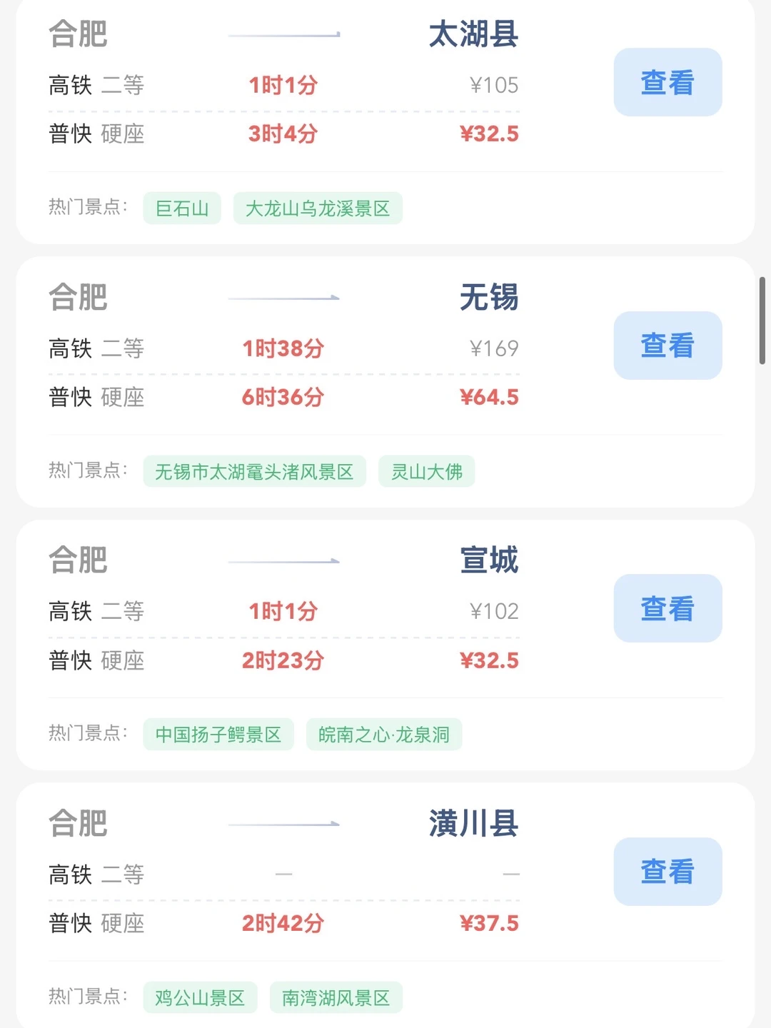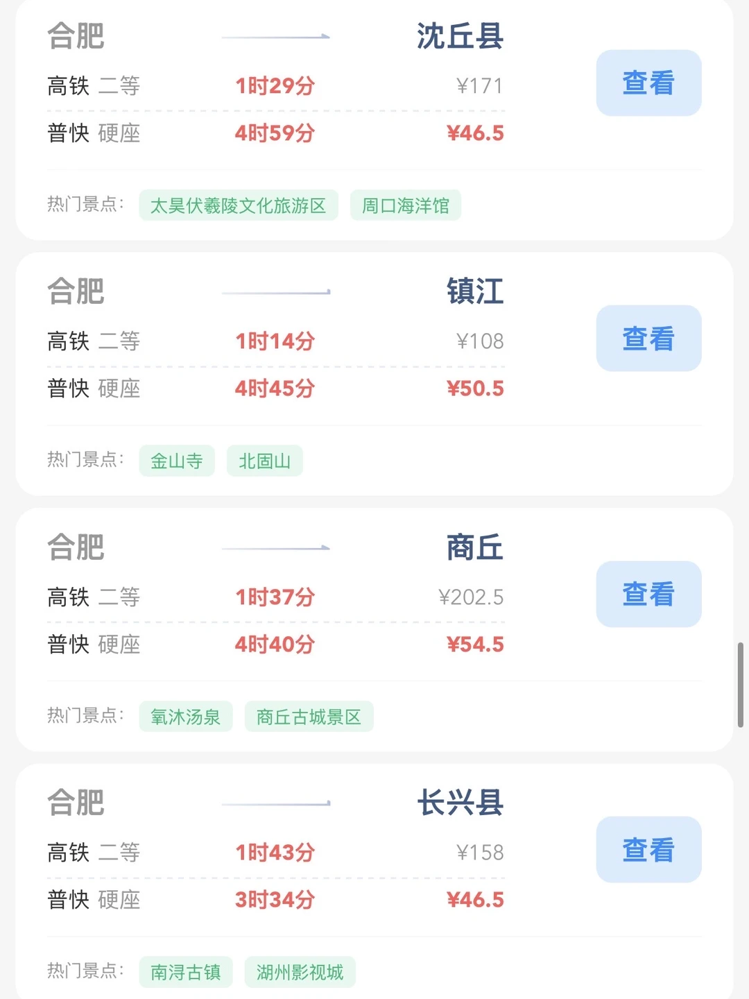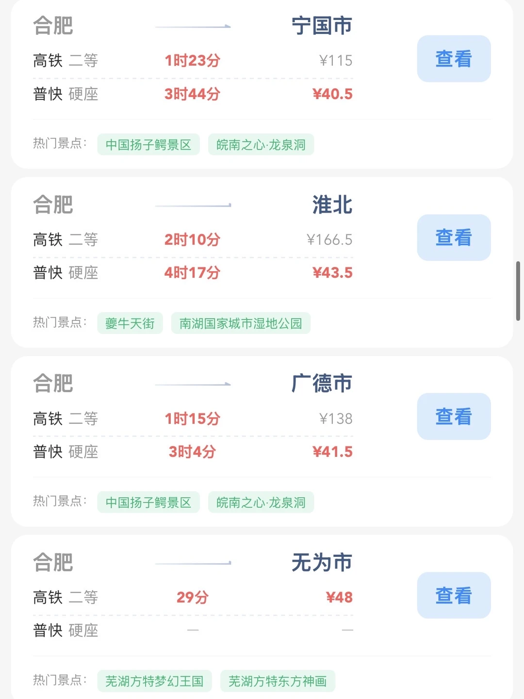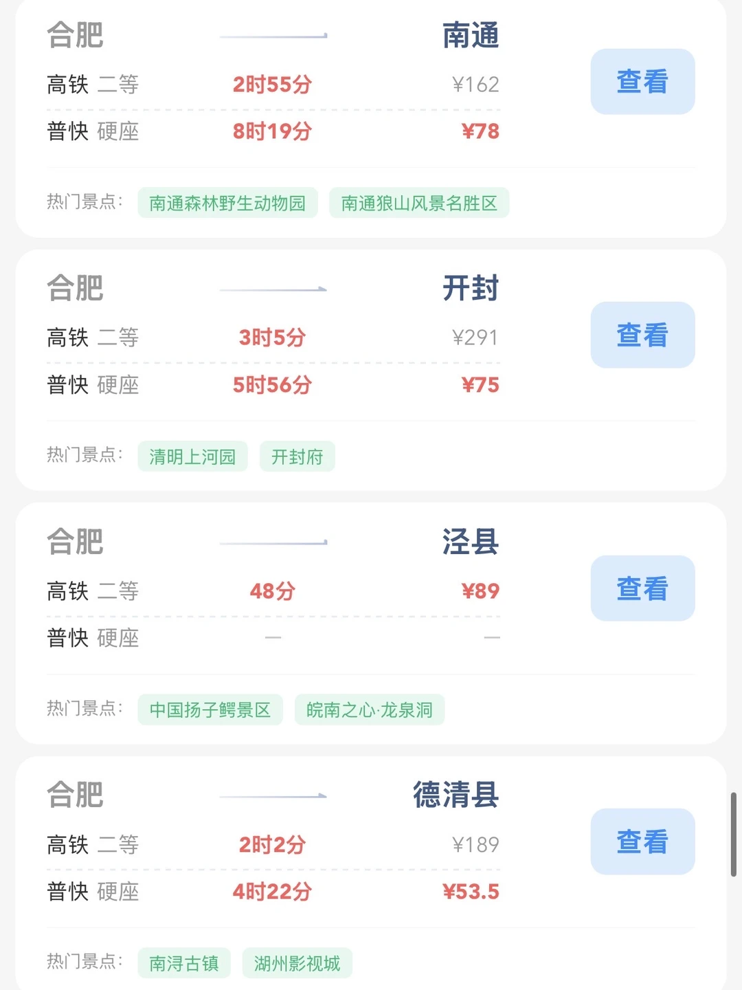 帮大家整理了一份合肥出发100块的火车票就能直达的旅游城市名单