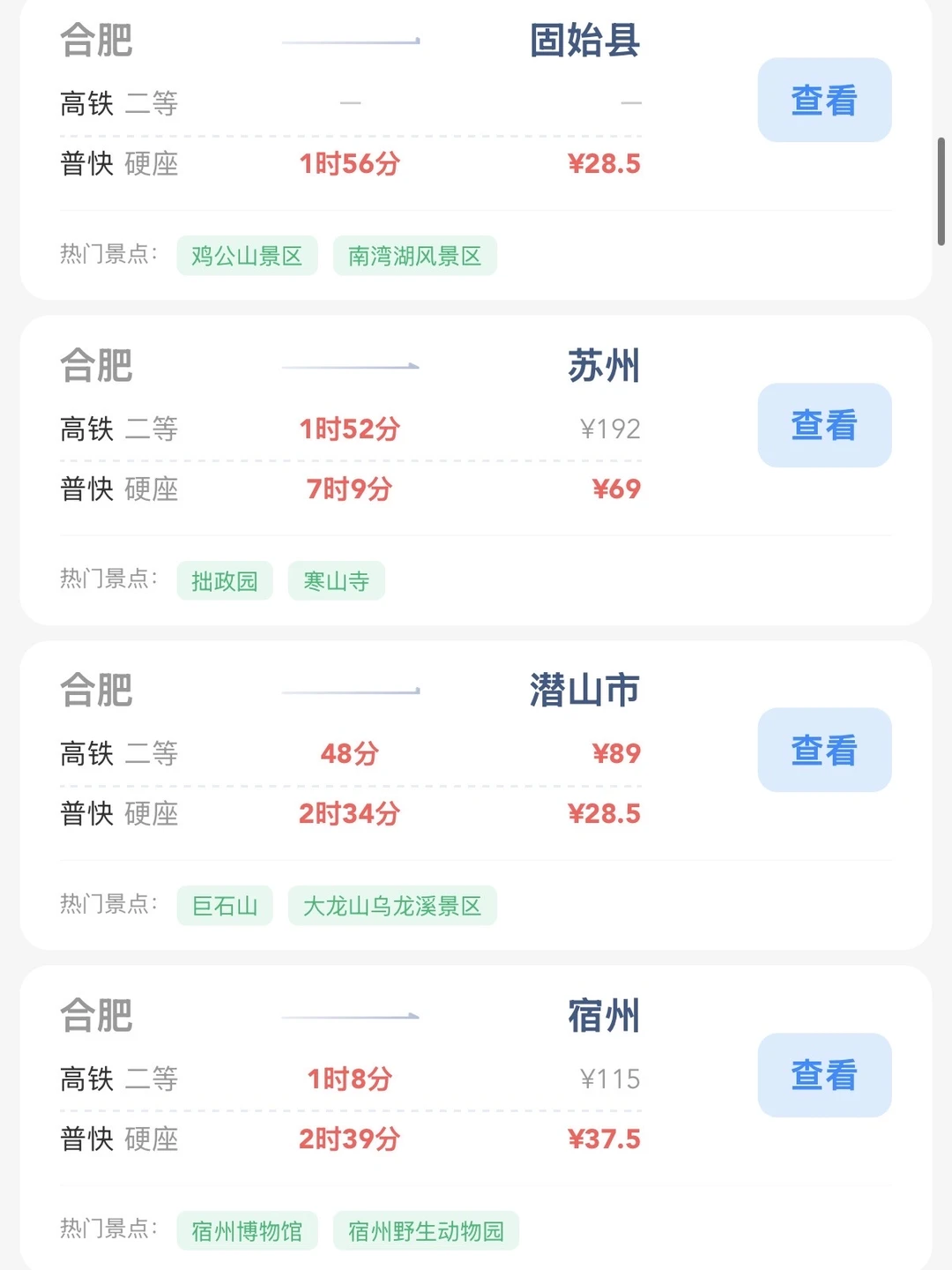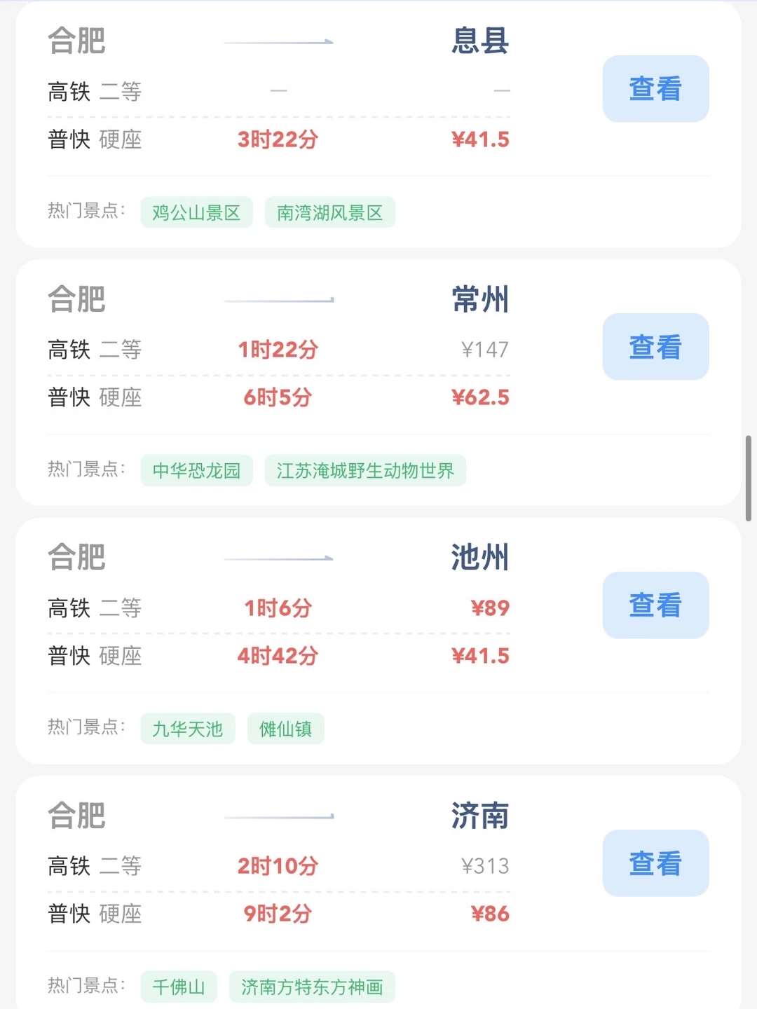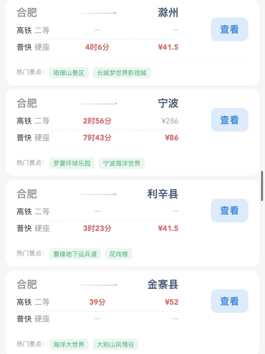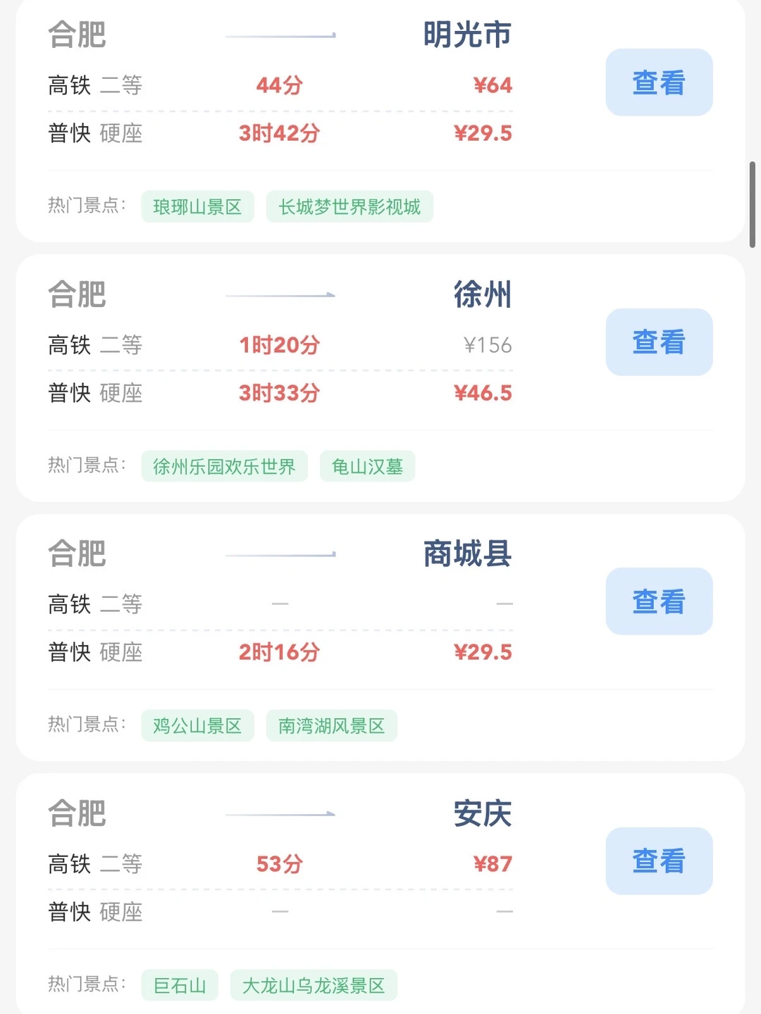 帮大家整理了一份合肥出发100块的火车票就能直达的旅游城市名单