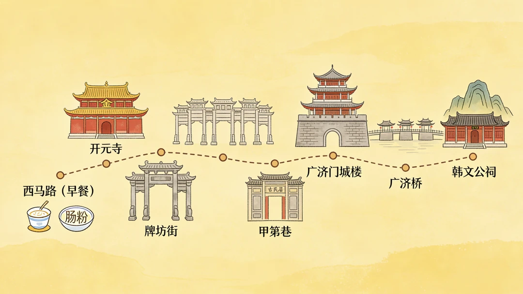 古城正门,登楼俯瞰韩江与牌坊街全景。