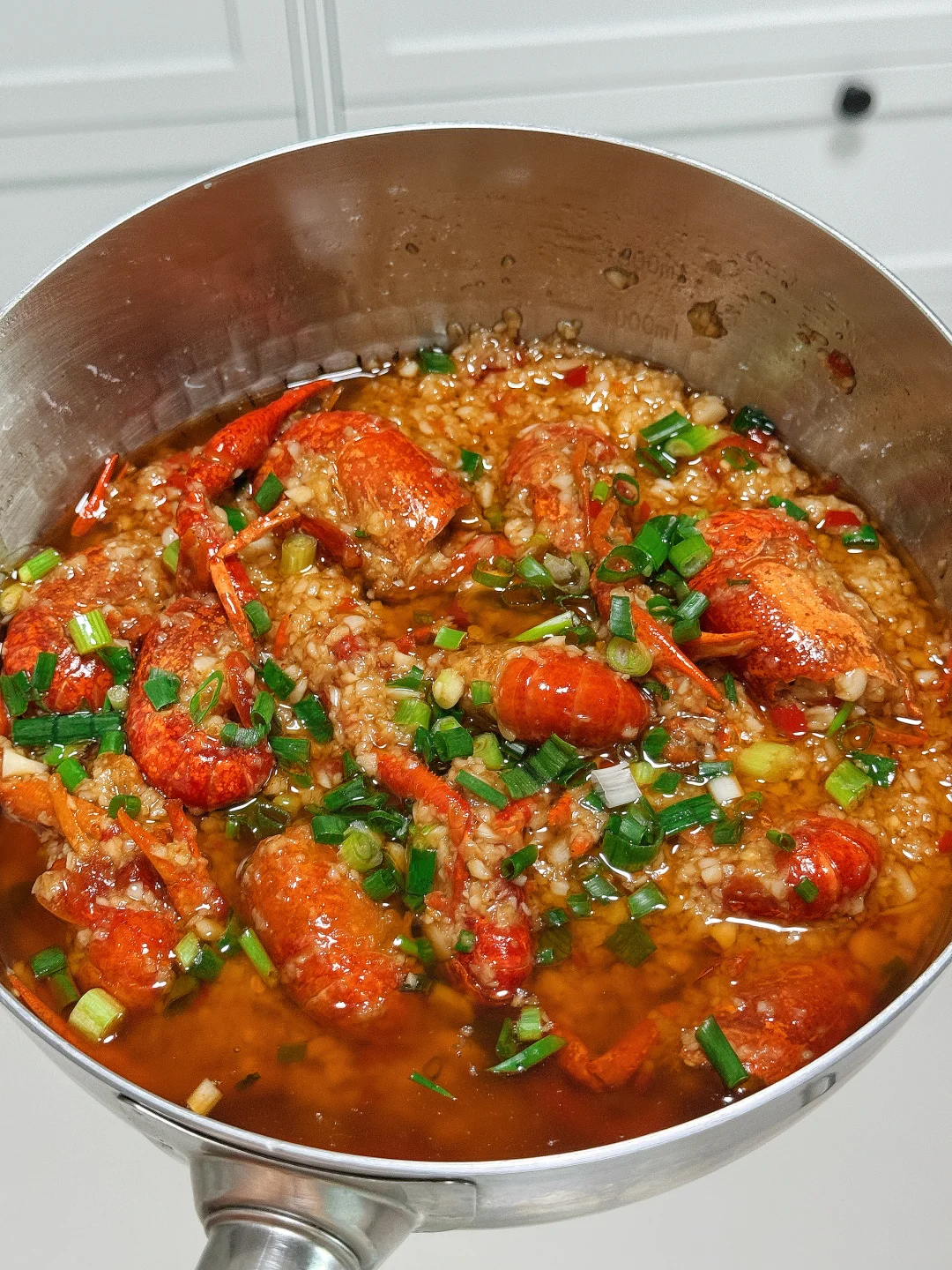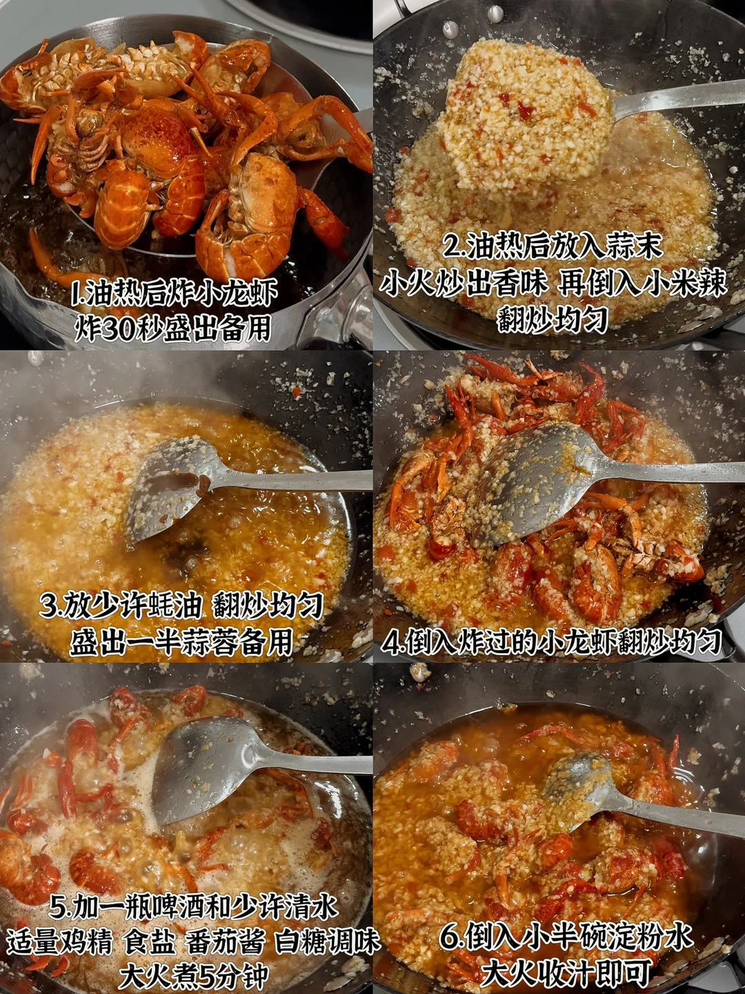📜食材:蒜末、小龙虾、小米辣 🍳做法: 1.油热后先把小龙虾大火炸30秒,盛出备用 2.继续炸过小龙虾的油,放入蒜末小火炒出香味 3.倒入适量小米辣,翻炒均匀 4.加入适量蚝油翻炒均匀,盛出一部分备用 5.放入小龙虾翻炒均匀 6.加入一瓶啤酒和少许清水,放适量食盐,鸡精,白糖,番茄酱调味 7.大火煮5分钟 8.加入小半碗淀粉水,大火收汁,撒上葱花即可。