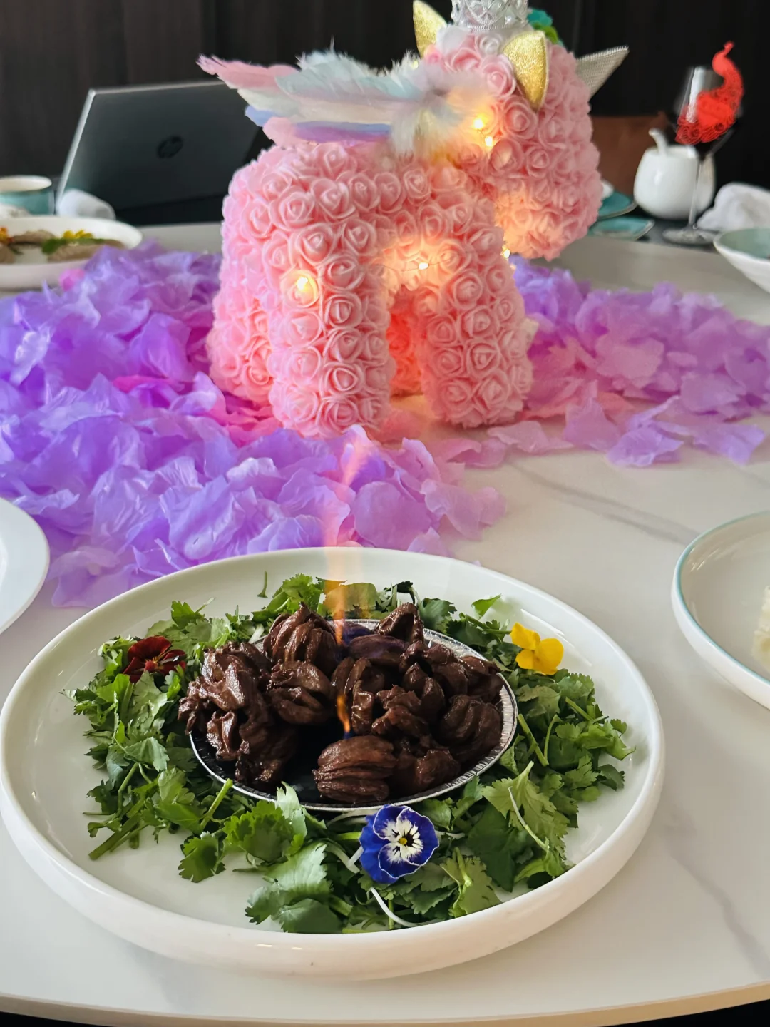 • 餐盘用巧克力粉写专属名字藏头诗,还有“生日快乐”烫金餐盘,被认真对待的感觉太好哭了