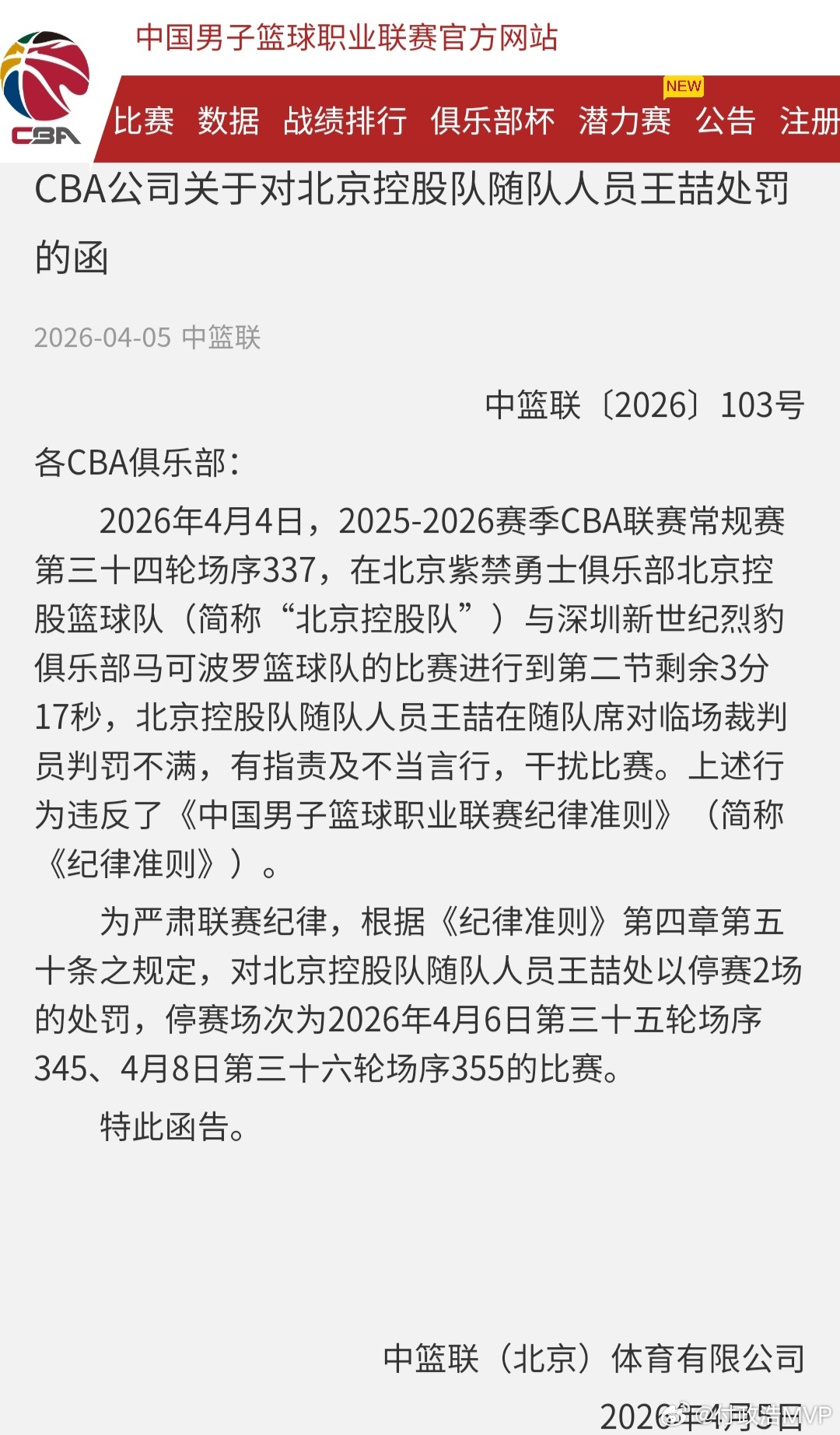 CBA开出罚单:在北控男篮被深圳男篮史密斯压哨绝杀的比赛中,北控体能教练王喆指责裁判且有不当言行,干扰比赛。王喆被停赛2场。