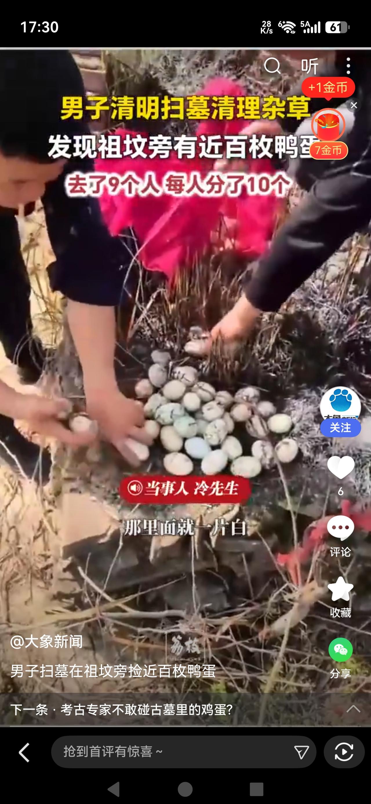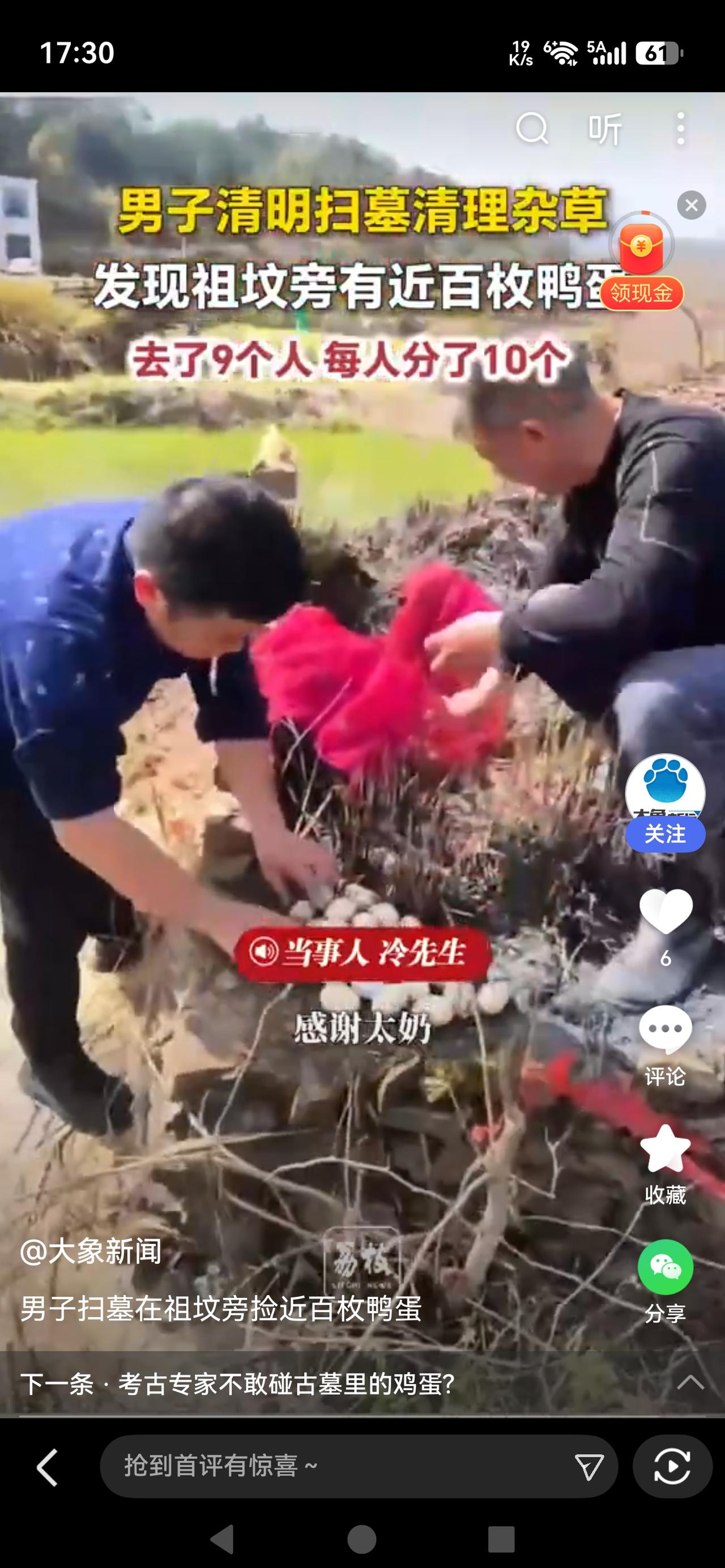 《扫墓扫出“鸭蛋大丰收”!男子祖坟旁捡近百枚,网友:祖宗显灵了?》 清明祭扫时,江西九江一男子在祖坟草丛中发现近百枚鸭蛋,同行9人平分,大家笑称是祖先赐福。这是乡村生态变好、野鸭栖息繁衍的自然现象,并非神秘预兆。事件走红网络,本质是国人对亲情与吉祥的朴素向往,用轻松幽默的方式寄托对先人的思念,也折射出乡村生态改善的喜人变化。 看完直接笑出声,这大概是清明最暖心的意外惊喜!清理杂草突然翻出一堆白花花的鸭蛋,整整近百枚,一家人平分,人人有份,福气均沾,谁看了不羡慕? 网友调侃“太奶心疼后人,特意送的土特产”,一句玩笑话,藏着中国人最温柔的念想。我们祭拜先人,求的不是大富大贵,而是平安顺遂、阖家团圆,这份小幸运,刚好戳中了心底的柔软。 有人较真说就是野鸭蛋,没必要神化。可生活本就需要一点小浪漫,把寻常巧合当成美好预兆,把思念藏在玩笑里,何尝不是一种幸福? 更值得开心的是,野鸭敢在祖坟旁筑巢,说明家乡山清水秀、环境越来越好,人与自然和谐相处,这才是真正的好兆头。 清明的意义,从来不是迷信,而是铭记亲情、珍惜当下。一枚小小的鸭蛋,装的是思念,藏的是福气,更是日子越过越旺的希望。 你遇到过这么巧的喜事吗?评论区沾沾喜气!