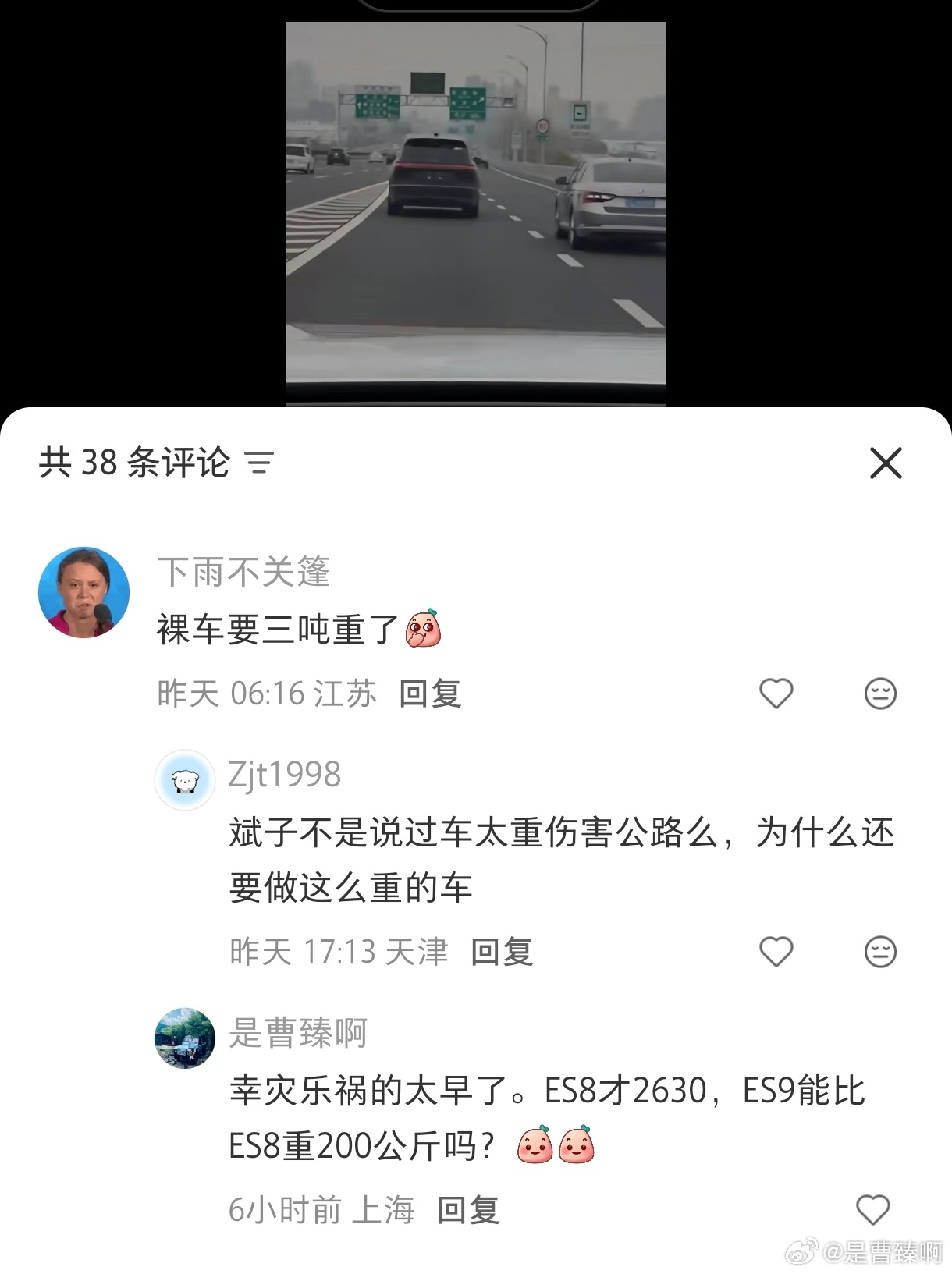 已经有人准备开喷蔚来ES9的体重了。它们觉得,斌哥吐槽过车辆太重会压坏马路,于是