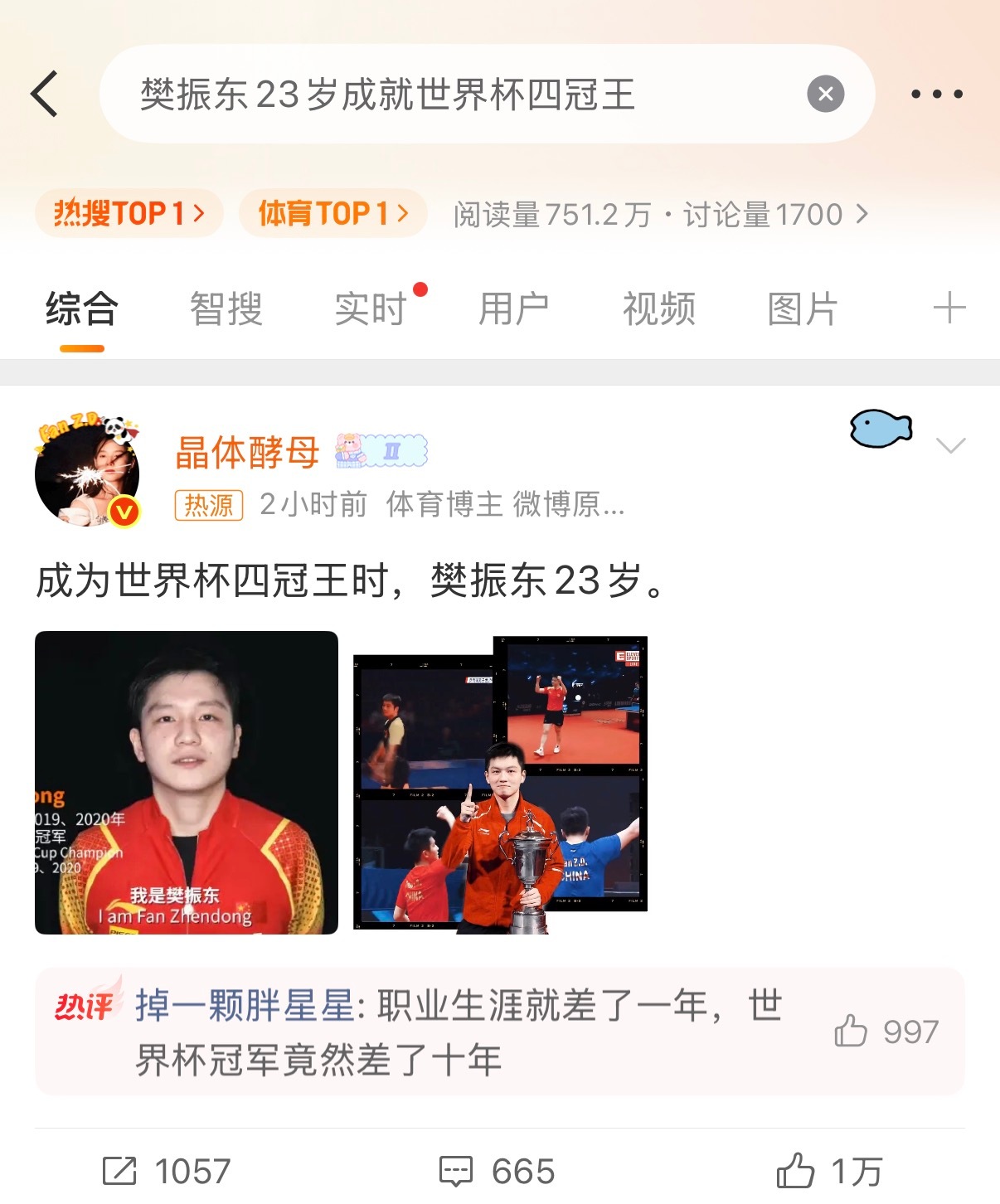樊振东23岁成就世界杯四冠王 打卡一下热搜第一