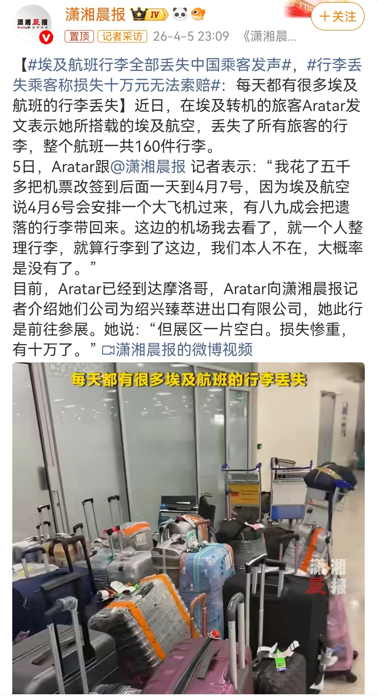 4月2日,中国旅客Aratar搭乘埃及航空经埃及转机前往摩洛哥,准备参加当地重要国际贸易展会。作为绍兴臻萃进出口有限公司员工,她和同航班159名乘客落地后发现,160件托运行李全部未被装机,直接“蒸发”。