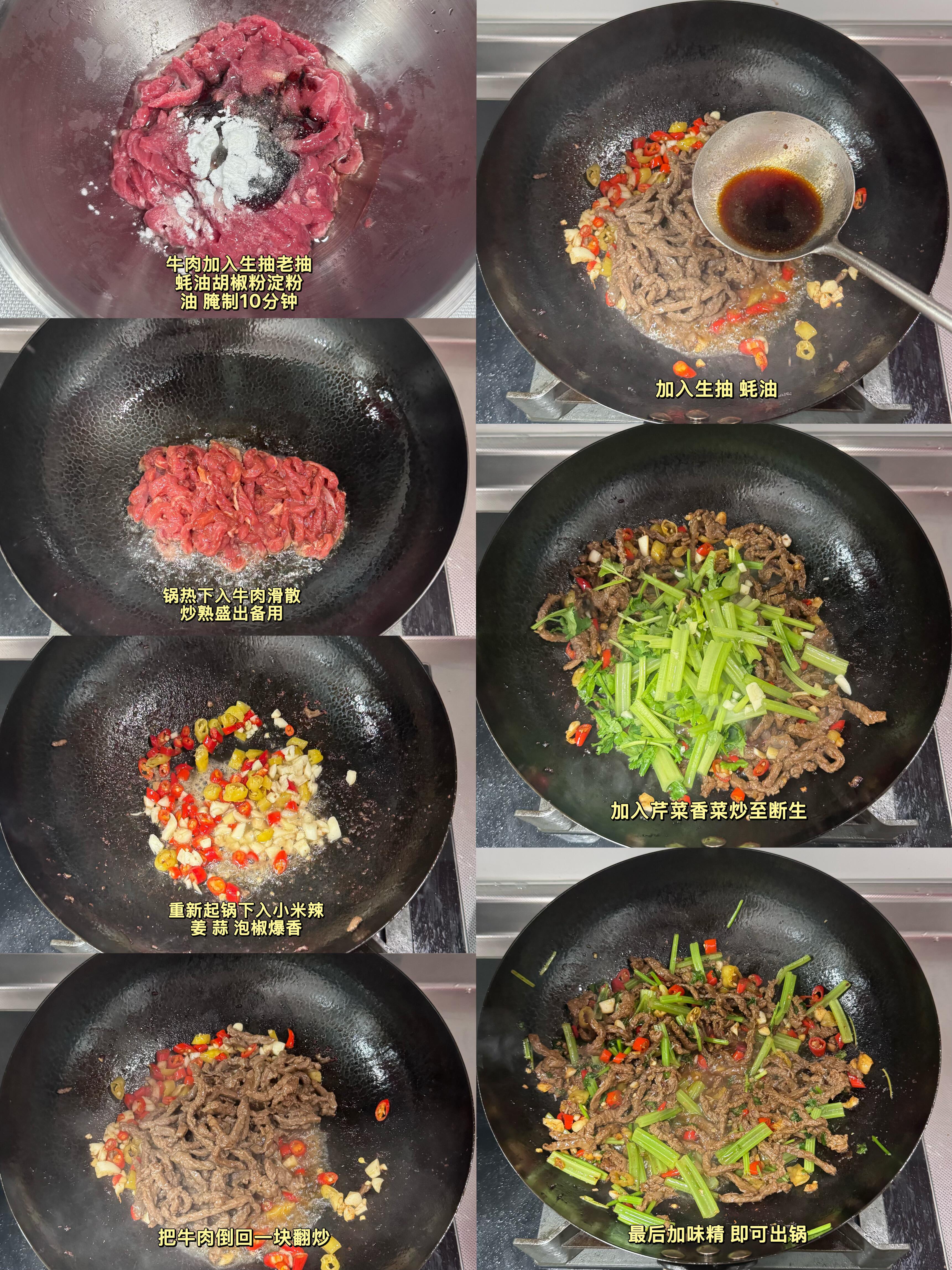 谁懂啊!这道芹菜炒牛肉,鲜辣入味能炫3碗饭🔥 救命!这道芹菜炒牛肉直接封神😭 牛肉嫩到筷子一夹就断,入口即化不柴不塞牙,芹菜脆嫩爆汁,没有一点涩味 小米辣的鲜辣+泡椒的酸爽,一炒就香到迷糊,香味直接焊在锅里,飘满整个厨房,闻着就流口水! 重点是!配米饭我能狂炫三碗,连汤汁都舍不得浪费,拌着饭吃直接香晕✨ 而且做法巨简单,不用复杂调料,手残党跟着做,一次就能成功,零失败! ✅ 详细步骤(记好这2个嫩肉关键,新手也能做好) 1️⃣ 牛肉切成薄一点的片,加1勺生抽、半勺老抽、1勺蚝油、少许胡椒粉、1勺淀粉,再淋1勺食用油,用手抓匀,腌10分钟(这步是牛肉滑嫩的关键,别偷懒!) 2️⃣ 热锅多放一点油,油热后下腌好的牛肉,快速滑散,炒到表面变色就立刻盛出来(千万别炒久,炒老就柴了,巨影响口感!) 3️⃣ 锅里留底油,放入小米辣、姜片、蒜末、泡椒,小火爆香,然后把炒好的牛肉倒回锅里,加少许生抽和蚝油,快速翻炒均匀 4️⃣ 最后放入芹菜段和香菜,大火翻炒30秒,炒到芹菜断生,加一点点味精提鲜,直接出锅! 一口下去太绝了!牛肉的鲜、芹菜的脆、辣椒的鲜辣,在嘴里瞬间爆开,层次拉满,香到连锅边的油都想舔干净✅ 关键是减脂期也能放心吃!高蛋白低热量,好吃不胖,既能解馋,又不用怕长肉,减脂党也能实现炒菜自由~