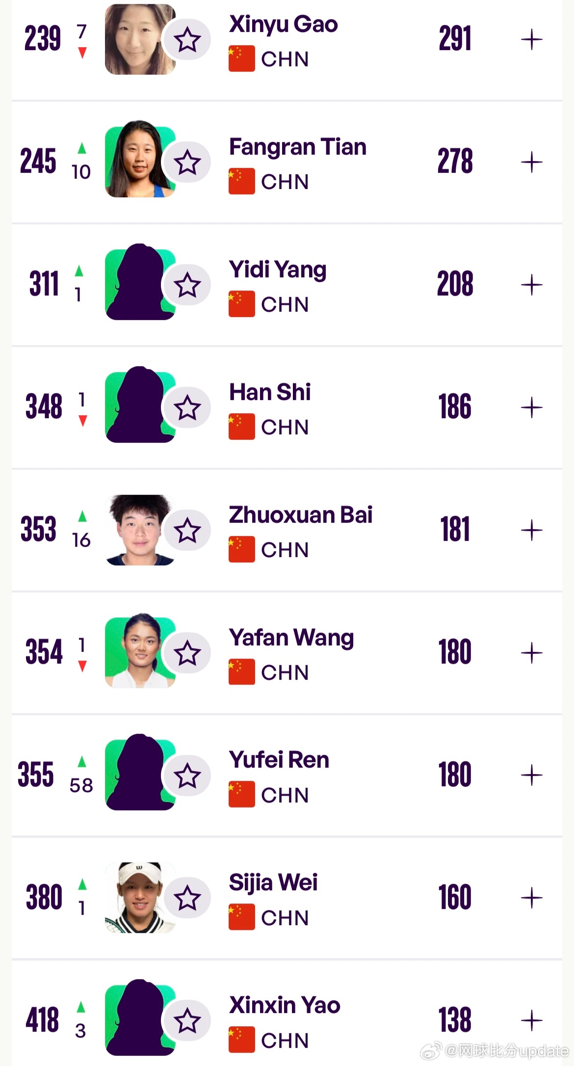 周六安表现出色的 尤晓迪、任钰菲、王曦雨等排名上升。✈️ 田方然、杨一迪、 任钰菲 、王佳祺 刷新职业生涯最高排名