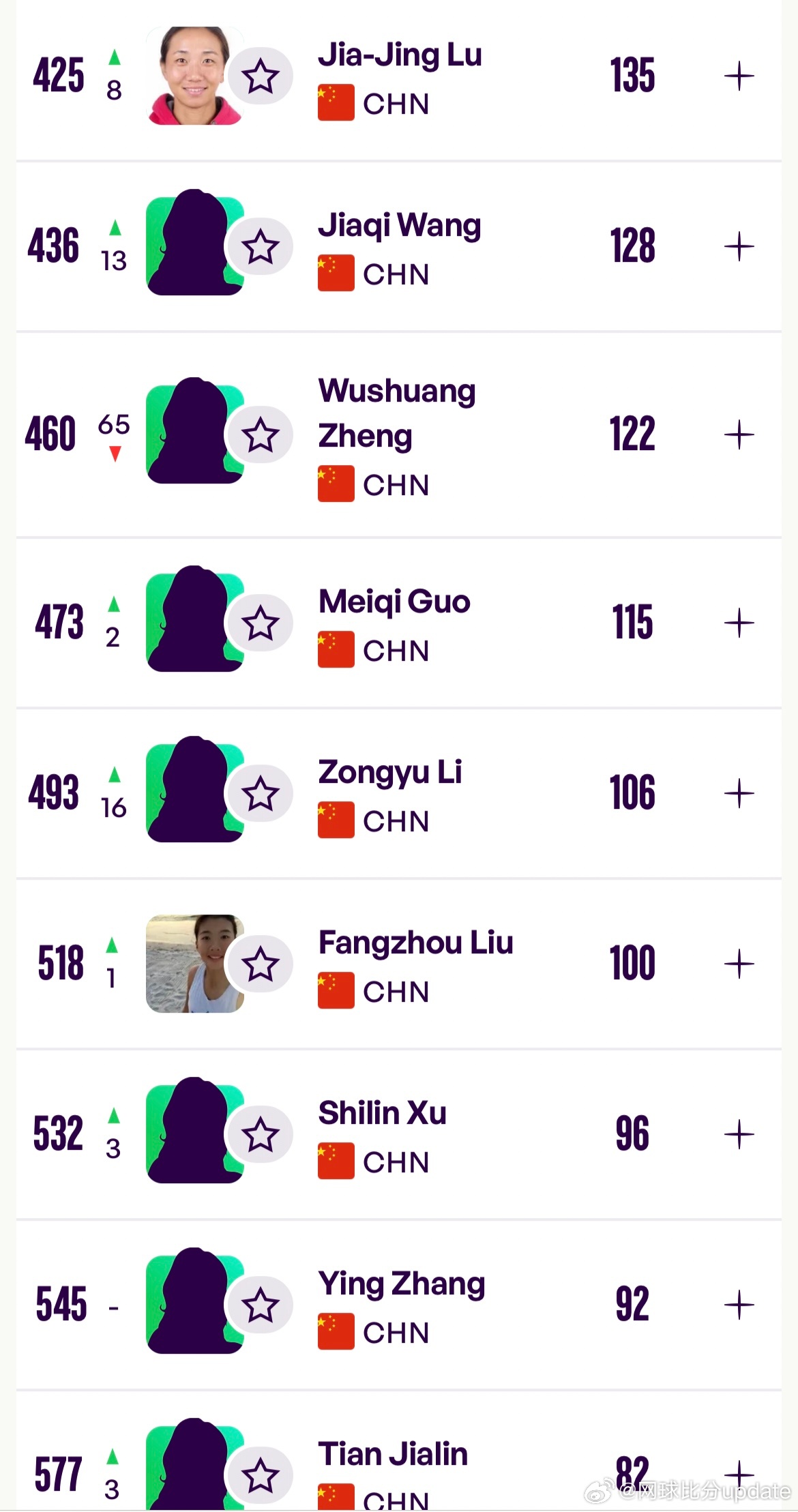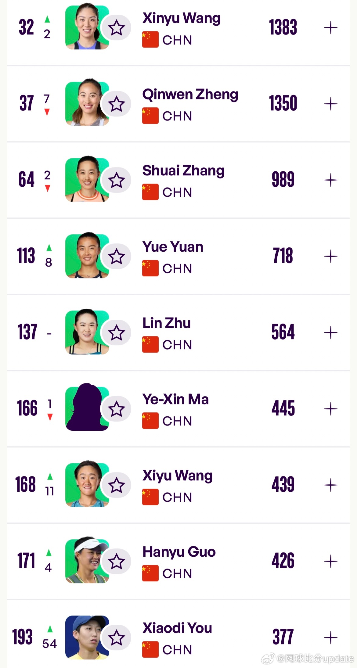 女单排名(Top500)🇨🇳王欣瑜:32🇨🇳郑钦文:37🇨🇳张帅:64