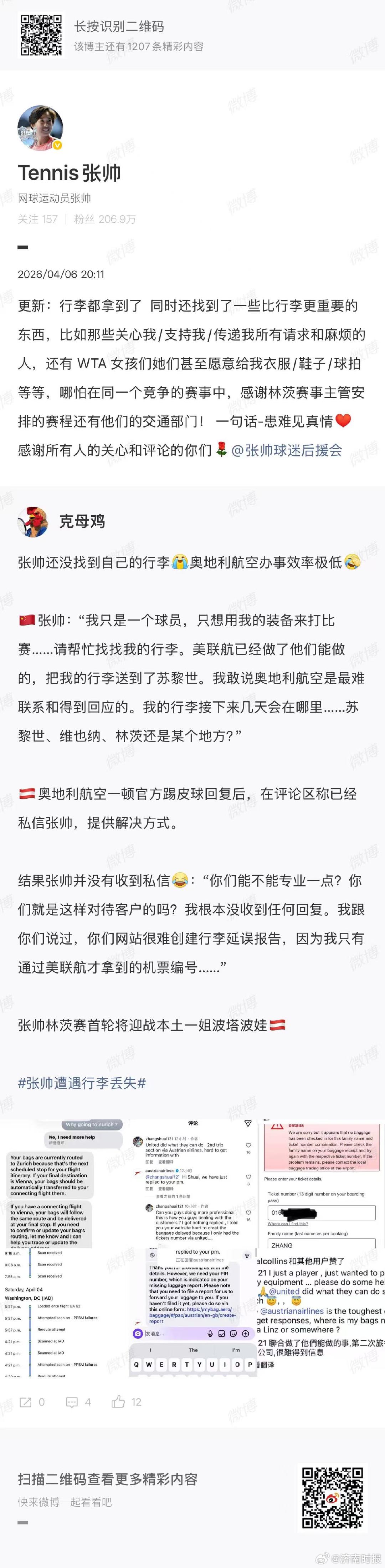 【#张帅的行李拿到了#】#张帅回应行李滞留华盛顿机场# 4月4日,网球运动员从美国转战奥地利林茨参赛,但托运行李(含全部运动装备)滞留在华盛顿机场。问题源于美联航与奥地利航空的跨国联运衔接失误。